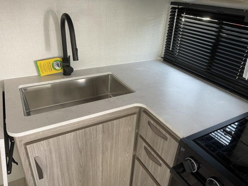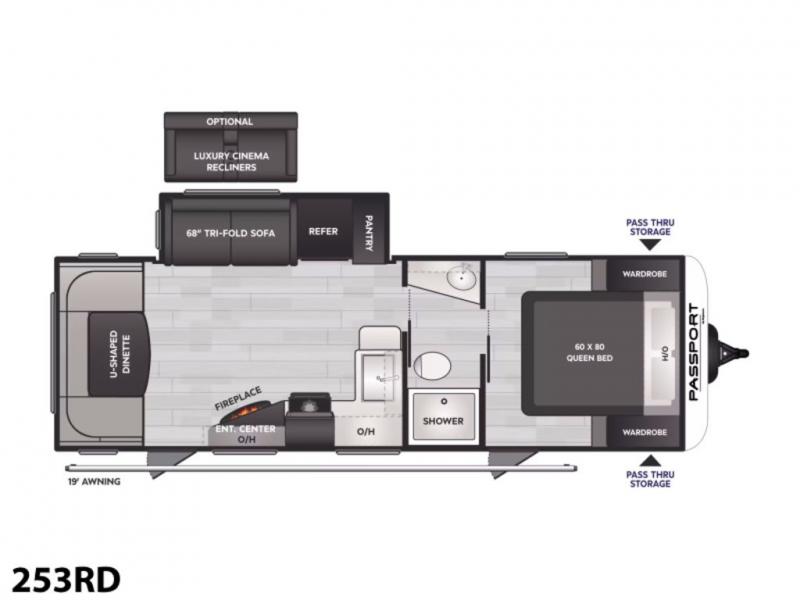 With any Keystone Passport SL you will enjoy lightweight towing and lots of interior comforts! The power tongue jack lets you hitch up at the drop of a hat, and the Dexter torsion axle rubber ride suspension will make towing easier than ever. You will appreciate having power stabilizer jacks for quick setup and an exterior convenience center to monitor tank levels. These trailers are constructed with a seamless, laminated and gel-coated filon exterior, 80% tinted safety glass windows, and a one-piece polypropylene underbelly. The interior will have you feeling right at home with residential durable Beauflor vinyl flooring, deluxe night shades, LED lighting throughout, and seamless kitchen countertops to name a few comforts.