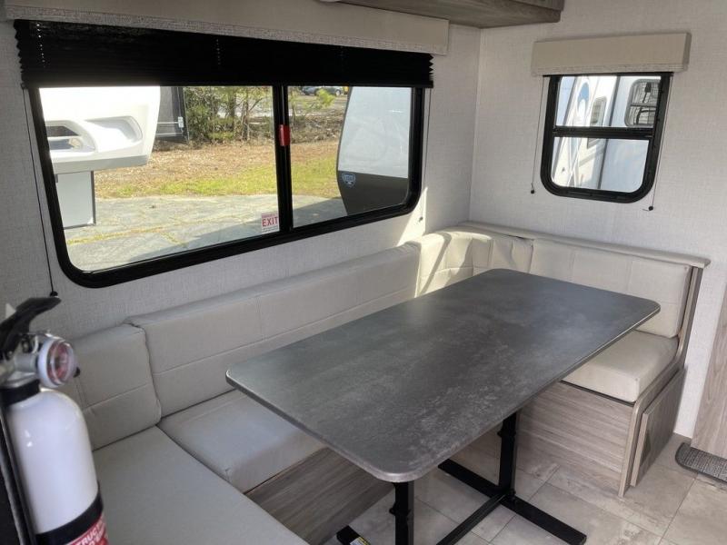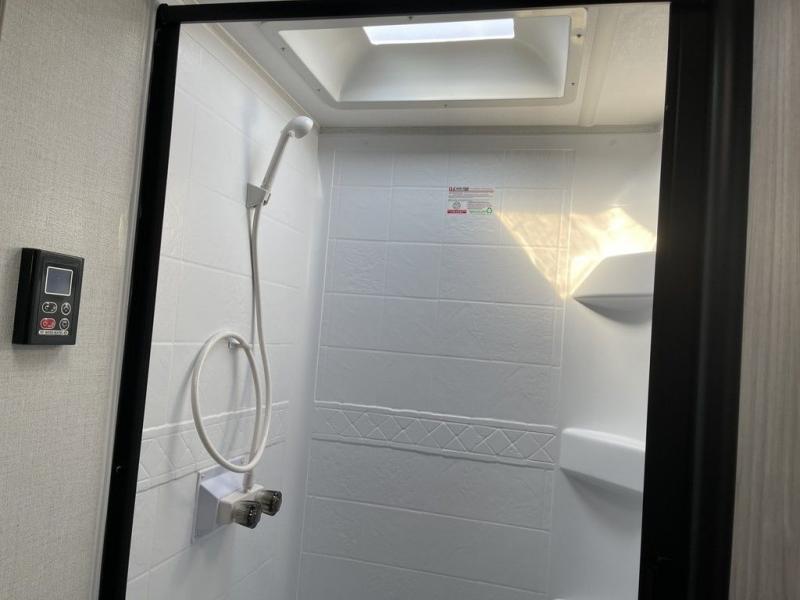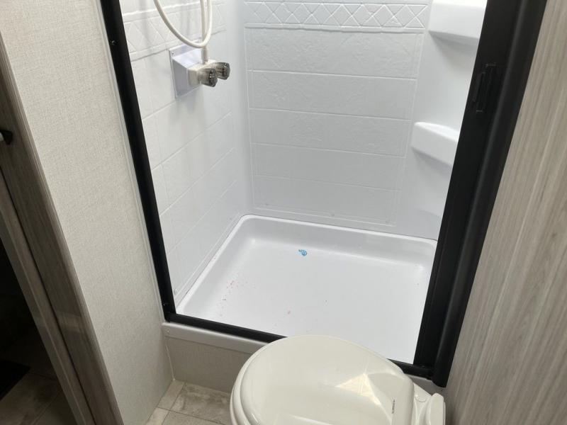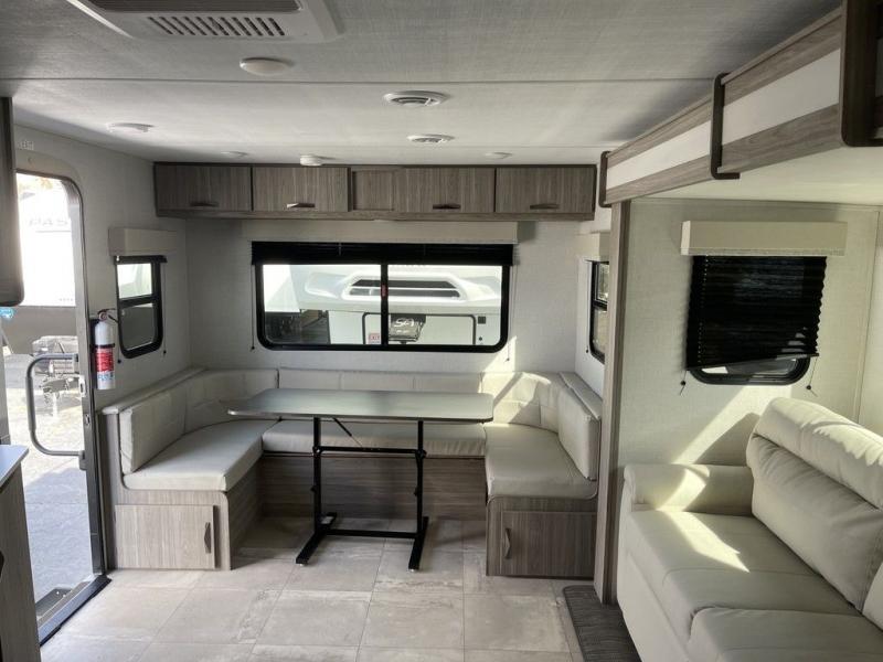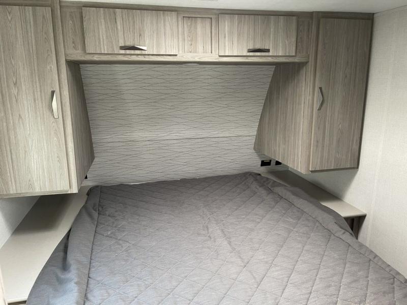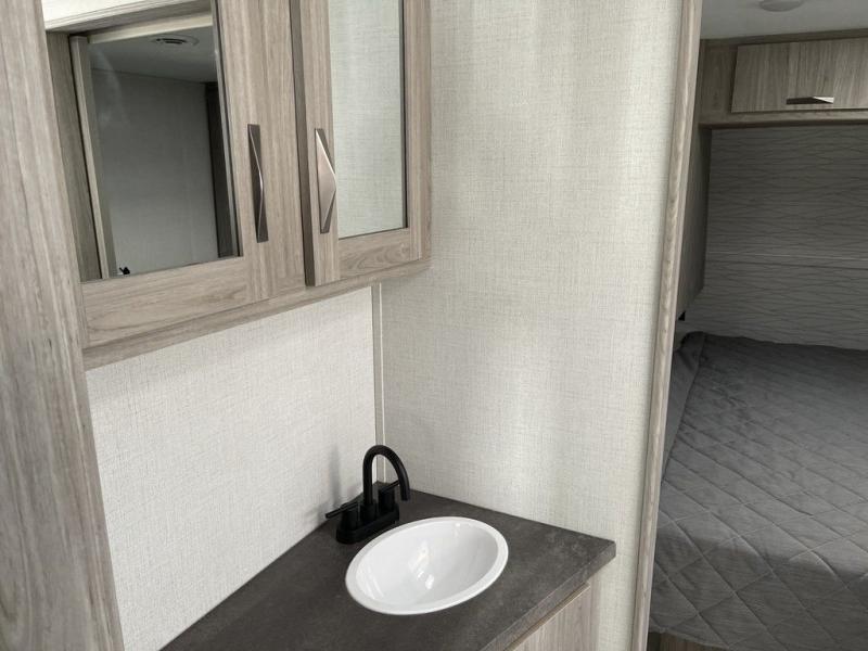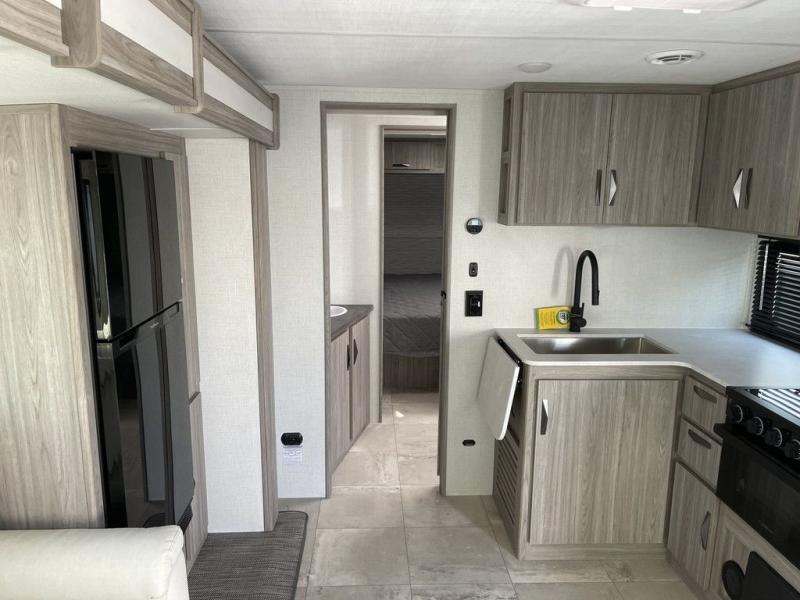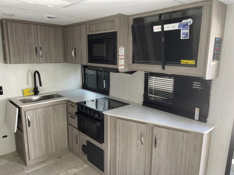 If you're looking to upgrade from a tent to a travel trailer, the time is now with this model! You will love having your own master bedroom up front with a queen bed, dual bedroom wardrobes and your own exterior entry door. The second entry door leads right into the combined kitchen and living area for added convenience. Your crew can dine or play a game around the do-more dinette table or relax on the tri-fold sofa across from the entertainment center. These pieces of furniture will also double as your guests' sleeping space at night, and you have the option to choose luxury cinema recliners in place of the sofa if you don't need that much sleeping room. There is also a full walk-through bath to clean up in each day plus a fully-equipped kitchen to make meals!