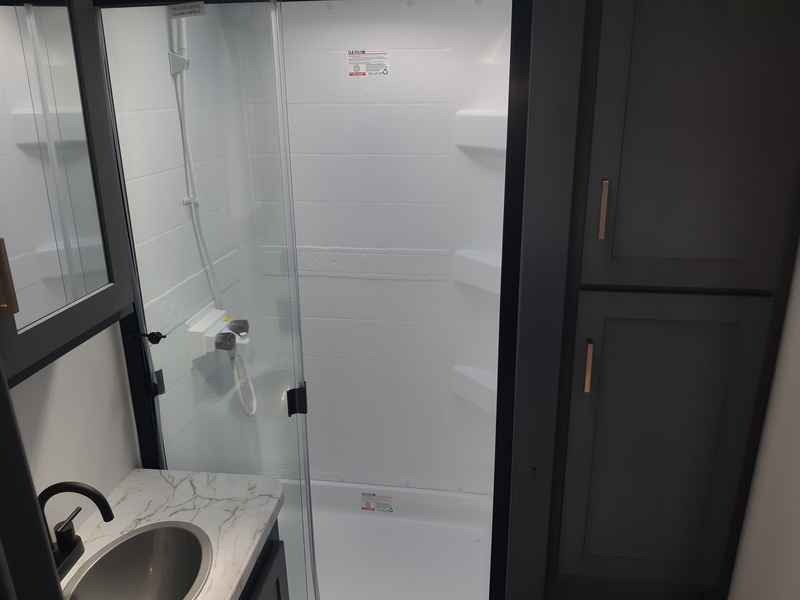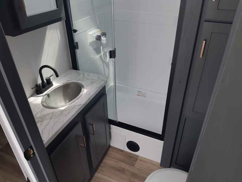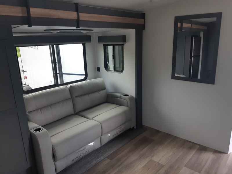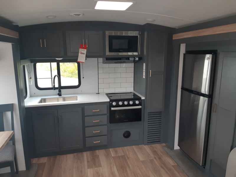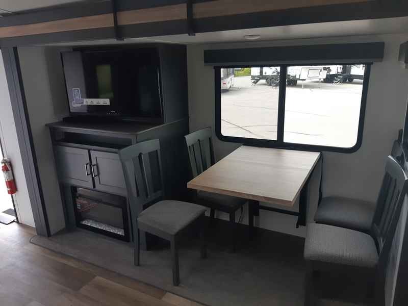 The chef will love cooking in the rear kitchen of this travel trailer! With two pantries and full depth cabinets, you will have plenty of room to store all of your cooking essentials. You can enjoy your meals at the free standing dinette then play a card game or relax on the 68" tri-fold sofa while enjoying the fireplace at the entertainment center. After a fun day at the beach, freshen up in the full bathroom with the full shower with built-in shelves and a skylight above for a view of the fluffy clouds and bright blue sky. Start your mornings feeling refreshed after sleeping on the queen bed in the front private bedroom and end your nights socializing together under the 19' power awning. There is also an outdoor kitchen with a Capital grill and a mini refrigerator!