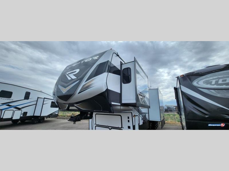 Experience a breath of fresh air with one of these Keystone RV Raptor fifth wheel toy haulers! Their rugged construction consists of a one-piece Alpha Super Flex TPO roof membrane, Dyna Span floor decking, and 5,000 lb. frame-welded tie- downs to keep your toys in place as you travel. Some unexpected conveniences you will appreciate include an Omni-Chill A/C system to keep you cool on those hot summer days, a Furrion backup camera and Hitch Vision to prevent damages, and a Generation 3 iN-Command smart automation system with Global Connect to make life easier. There is also designer style vinyl flooring throughout, along with hardwood ceiling treatment with LED accent lighting, beach wood and white cabinetry, and many more interior comforts!