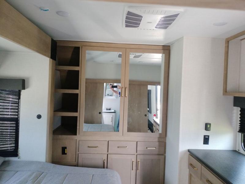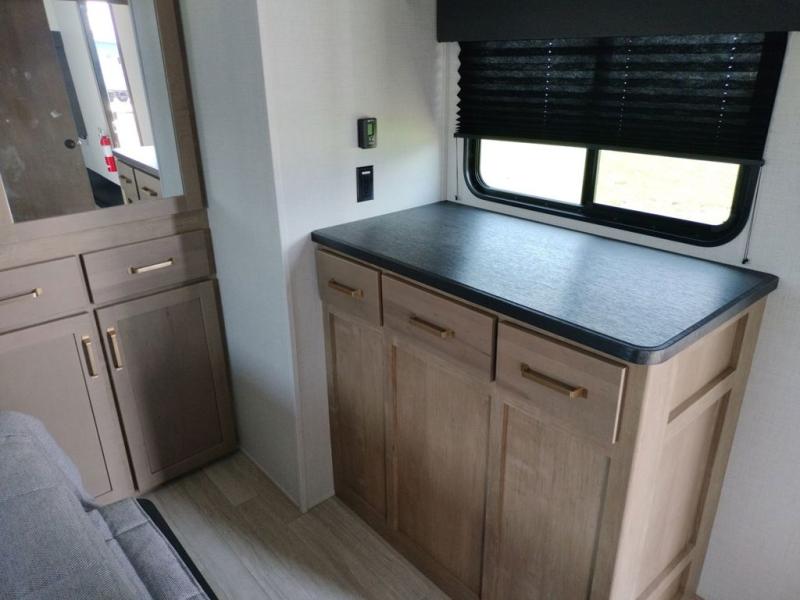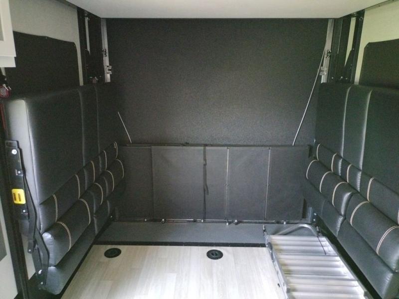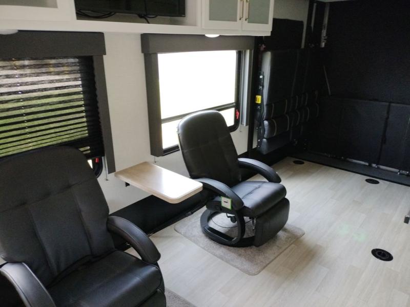 You won't believe the amount of comfort you'll find in this toy hauler and the generous storage space! In the bedroom you'll find a wardrobe with drawers, a closet, dresser, plus shelves so everything has a place to go. There is also king bed slide out, two benches, and a nightstand for your phone and book. Your guests can sleep on the dual opposing sofas and electric bed in the 17' garage area, or on the HappiJac sofa/folding bed. Once the chef of your group has made breakfast on the three burner range with a 17" black oven, you can relax on the dual swivel chairs with a flip-up table. After you've spent your day outdoors kicking up mud or kayaking on the lake, the dual entry bath will be waiting for your to clean up!