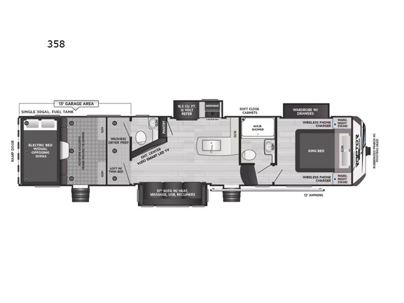 Load up your off-road toys for fun on the trails and comfort when you return to your campsite! You can relax on the sofa with recliners within a slide out in the main living and kitchen area or in the garage on the dual opposing sofas underneath the electric bed. Someone might even head up to the loft with a twin bed to take a nap. And there is a half bath in the 13' separate garage which will come in handy when your friends join you. You might even like to add a washer/dryer option in the garage to keep everything clean while away from home. The cook will love the large farmhouse style sink, the appliances to make meals, the pantry to store lots of goodies, and the peninsula countertop. And don't forget about the entertainment center with a 50" LED TV with surround sound. The full bathroom is next to the front bedroom which offers a king bed, wireless phone chargers and plenty of storage for your clothing including a slide out wardrobe.