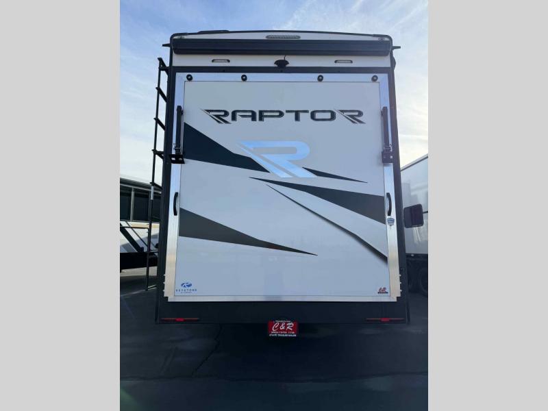 Experience a breath of fresh air with one of these Keystone RV Raptor fifth wheel toy haulers! Their rugged construction consists of a one-piece Alpha Super Flex TPO roof membrane, Dyna Span floor decking, and 5,000 lb. frame-welded tie- downs to keep your toys in place as you travel. Some unexpected conveniences you will appreciate include an Omni-Chill A/C system to keep you cool on those hot summer days, a Furrion backup camera and Hitch Vision to prevent damages, and a Generation 3 iN-Command smart automation system with Global Connect to make life easier. There is also designer style vinyl flooring throughout, along with hardwood ceiling treatment with LED accent lighting, beach wood and white cabinetry, and many more interior comforts!