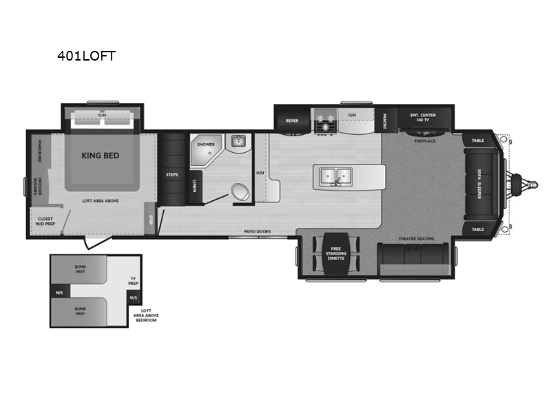 Get ready for fun at your own Residence each and every time you arrive! You will have your own king bed slide for more floor space in the bedroom, lots of clothing storage including a wardrobe, a dresser with drawers and a closet. You might like to add a washer/dryer to the closet to keep everything tidy. And the second entry/exit door allows you to sneak out for a walk or hike before everyone else wakes up. The loft area is where you will find the kids or your guests that will enjoy their own space, two bunk mats and two nightstands. The full bathroom will keep everyone refreshed, and the full kitchen will keep everyone fed. The cook will love the kitchen island and extra counter space, and the four-door refrigerator to store extra beverages. The front living offers a sofa sleeper, theatre seating, and a fireplace to enjoy while watching the 50" TV.