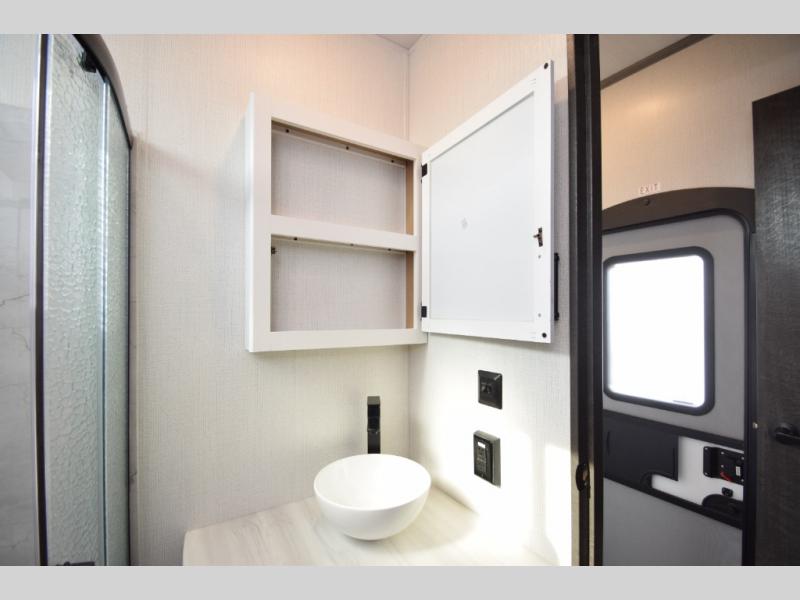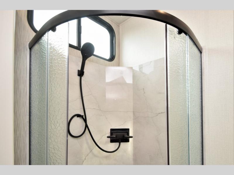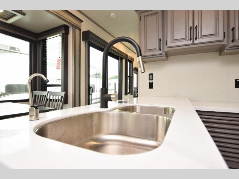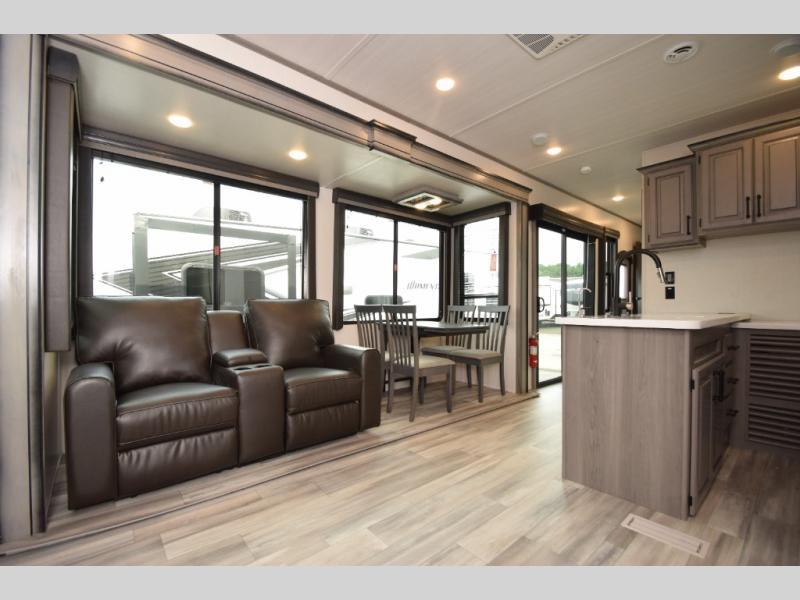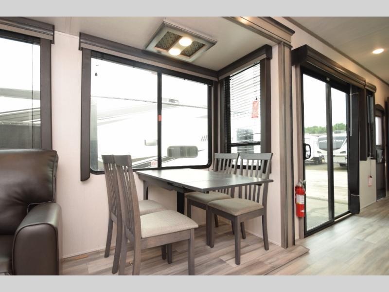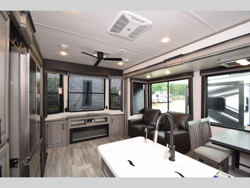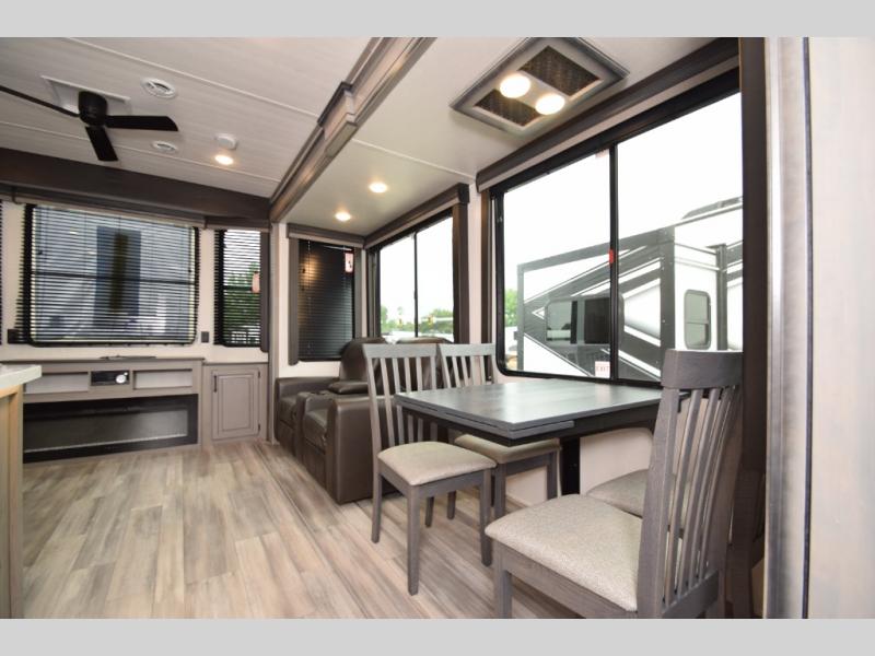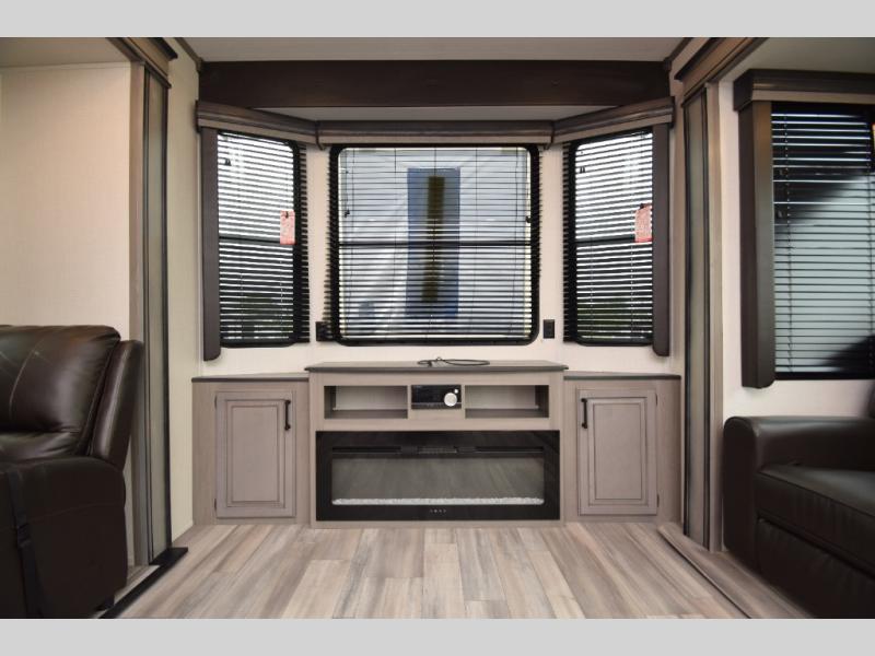Enjoy meals in the free-standing dinette, kick back in the dual recliners, and binge your favorite shows on the entertainment center with fireplace. This RV blends functionality with luxury so well, you might forget you're in a trailer.