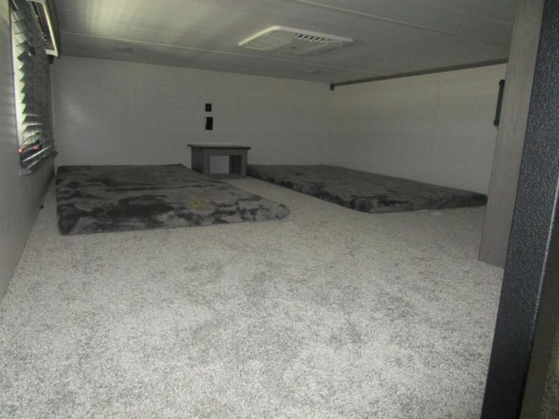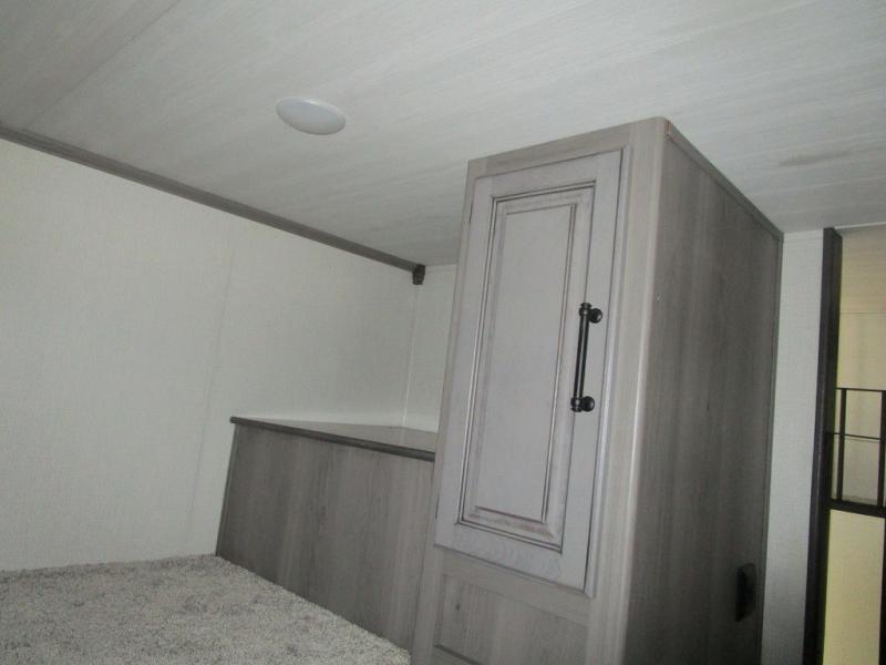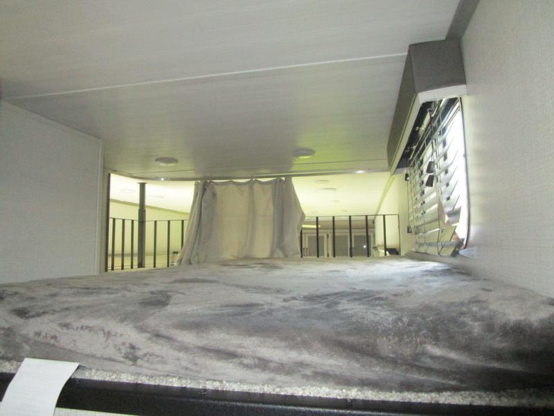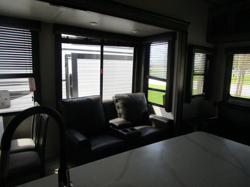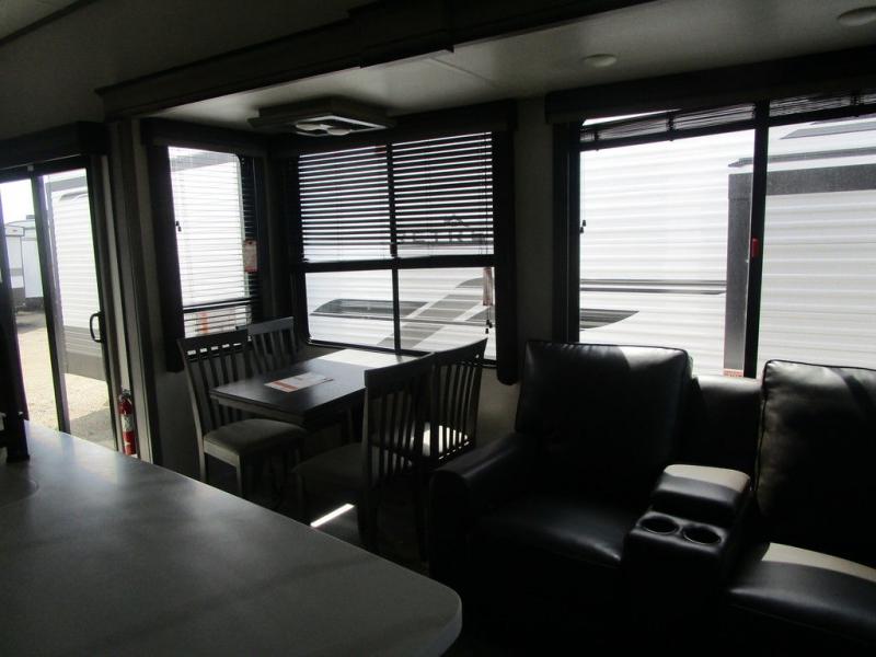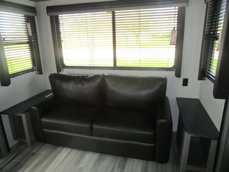For the ultimate getaway retreat, you need this Retreat destination trailer! With its 15 cu. ft. refrigerator, three-burner range top, and radius shower, you will have all of the basic amenities needed for everyday living, but this model doesn't stop there. You will also find plenty of extra special touches added throughout the interior, like the king-size bed and armoire in the private bedroom and the double-size loft above the bathroom. You will also thoroughly enjoy the comfort of lounging back in the theater seating with an ice-cold beverage sitting in the cup holder while you watch a movie on the 50" LED TV.