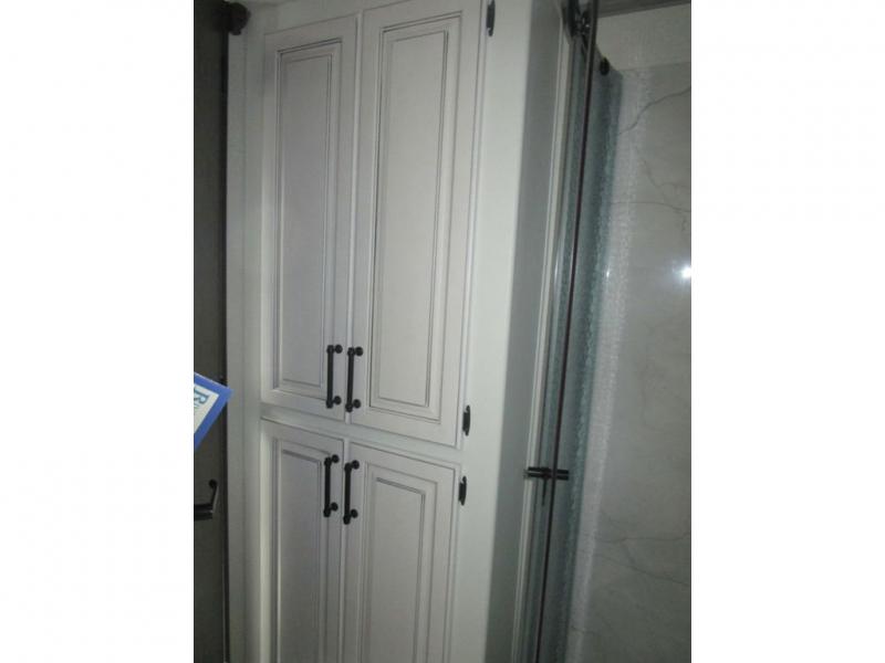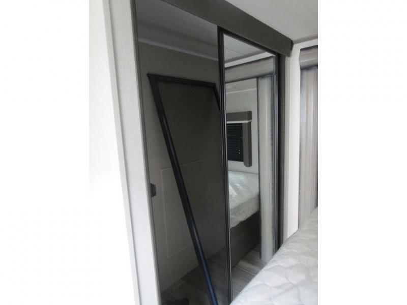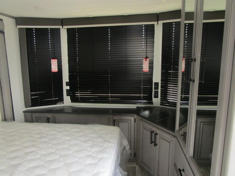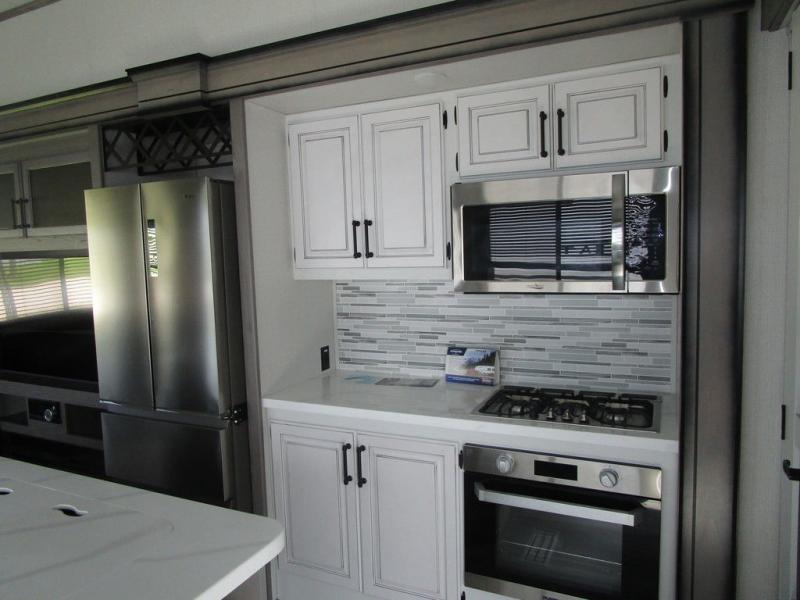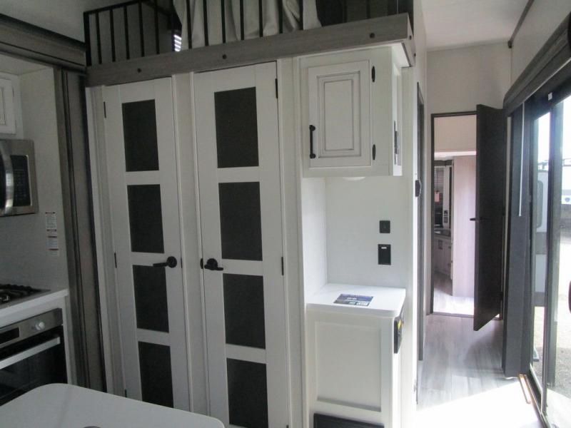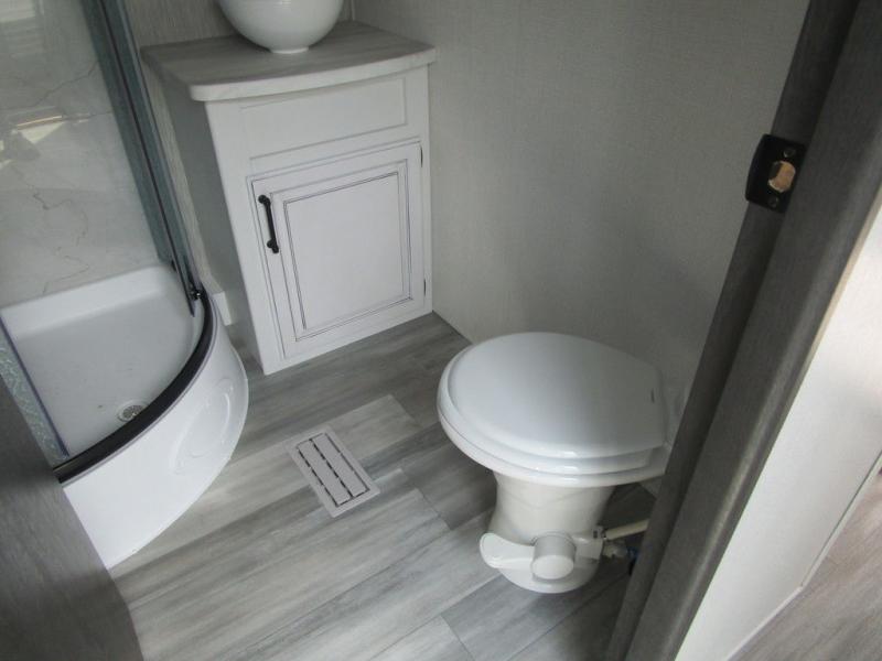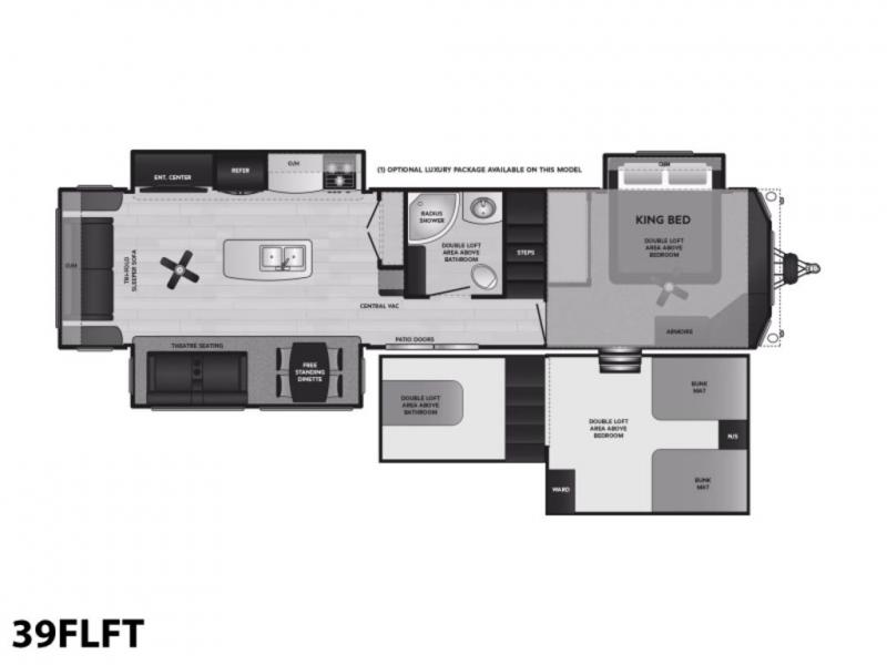 For the ultimate getaway retreat, you need this Retreat destination trailer! With its 15 cu. ft. refrigerator, three-burner range top, and radius shower, you will have all of the basic amenities needed for everyday living, but this model doesn't stop there. You will also find plenty of extra special touches added throughout the interior, like the king-size bed and armoire in the private bedroom and the double-size loft above the bathroom. You will also thoroughly enjoy the comfort of lounging back in the theater seating with an ice-cold beverage sitting in the cup holder while you watch a movie on the 50" LED TV.