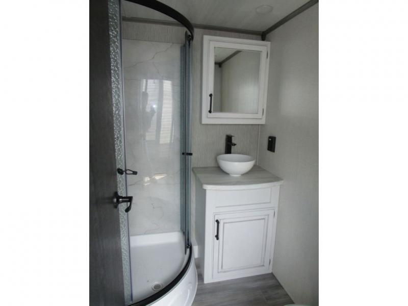 The Keystone Retreat destination trailer is a luxurious retreat in and of itself! You won't need to plan an extensive road trip because the Retreat gives you everything you need in one location. The enclosed underbelly will protect your unit from inclement weather, and the sliding glass doors make the Retreat feel like home. You can add an optional power awning with LED lights to create an outdoor party space, and the 8' interior comes with a ceiling fan that you can use to cool down your living area. There are also hardwood cabinet doors, framing, and slide fascia plus solid surface countertops and a stainless steel sink in the kitchen.