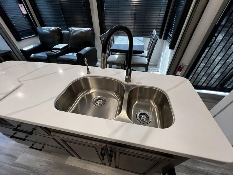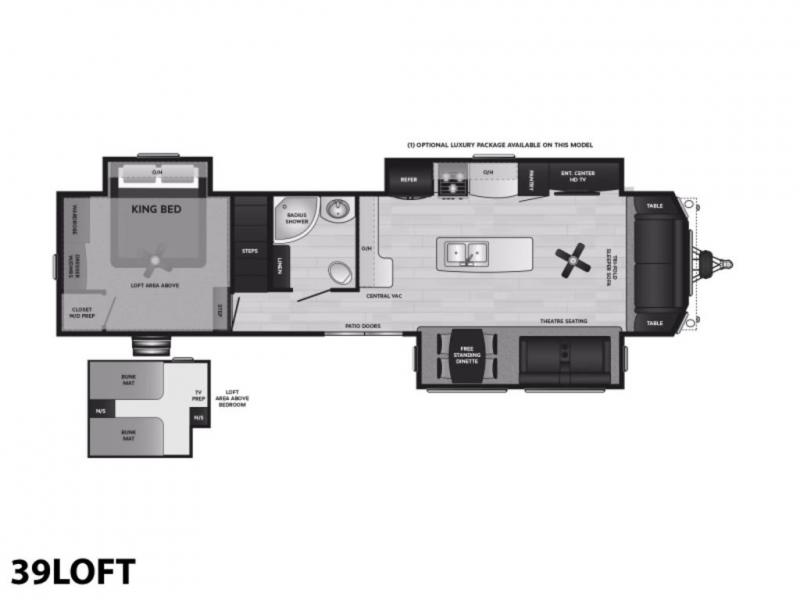 This Retreat destination trailer by Keystone RV brings you the feel of home all while you enjoy your camping experience. Your kids will love the loft and a place to call their own. There are two bunk mats and a place for a TV to be hooked up. There is also a central vacuum system that will help to keep this unit spic and span. Enjoy the private bedroom fit for a king with its king-size bed or relax with the family on the theatre seating in front of the 50" LED TV.