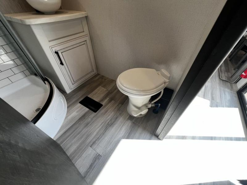The Keystone Retreat destination trailer is a luxurious retreat in and of itself! You won't need to plan an extensive road trip because the Retreat gives you everything you need in one location. The enclosed underbelly will protect your unit from inclement weather, and the sliding glass doors make the Retreat feel like home. You can add an optional power awning with LED lights to create an outdoor party space, and the 8' interior comes with a ceiling fan that you can use to cool down your living area. There are also hardwood cabinet doors, framing, and slide fascia plus solid surface countertops and a stainless steel sink in the kitchen.