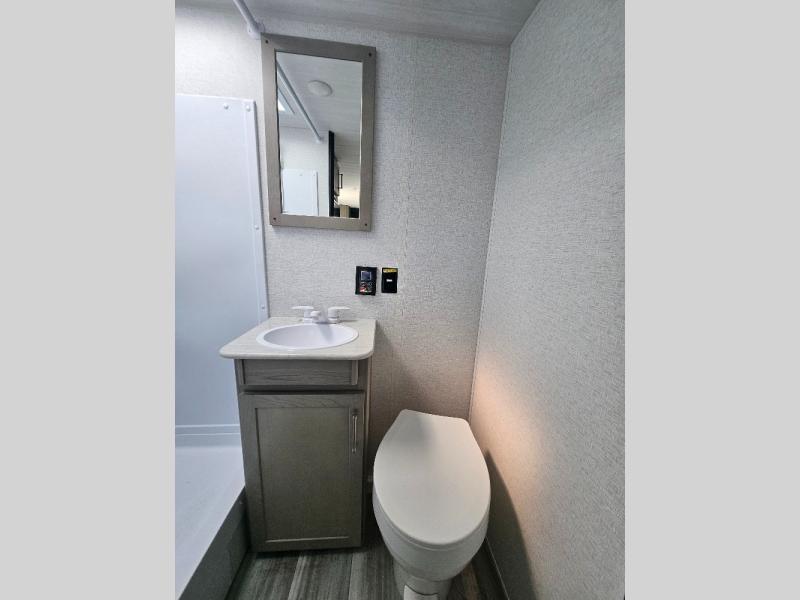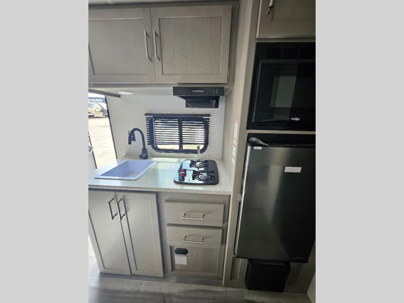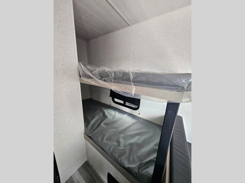 Get ready for outdoor fun with your favorite people when you have this trailer in tow! Once at your campsite, you can easily setup the 10' power awning, grab your camping chairs from the pass-through storage, and relax or start playing. The cook will love the galley kitchen with the two burner cooktop and microwave oven, plus a refrigerator for cold items. If you like, you can eat inside at the booth dinette which doubles as sleeping space, and of course the kids will love the bunk beds next to the full bathroom. And you will sleep soundly on the front queen bed.