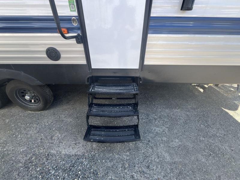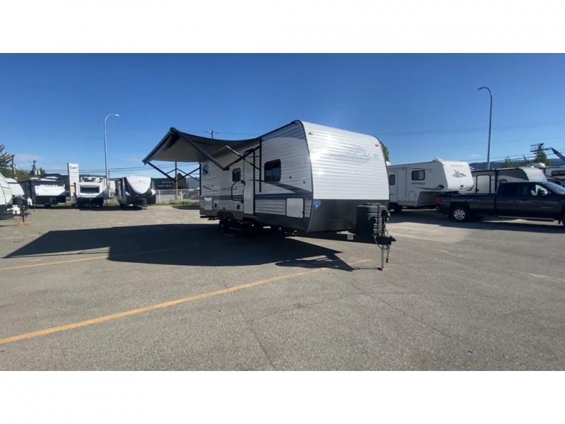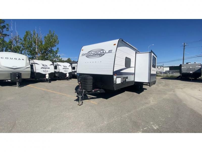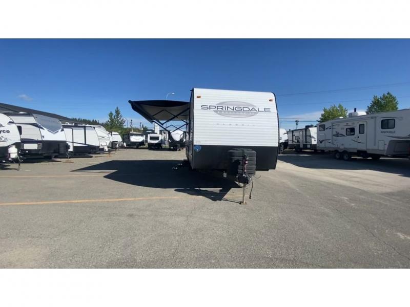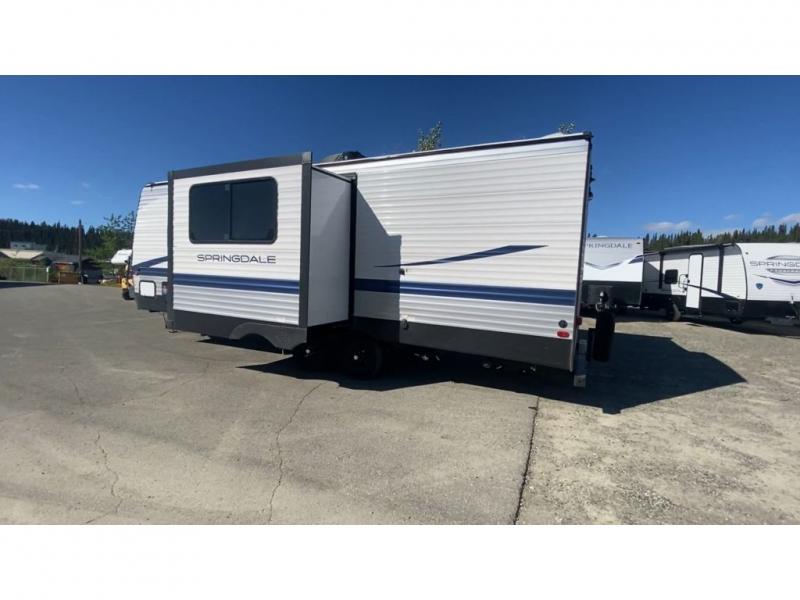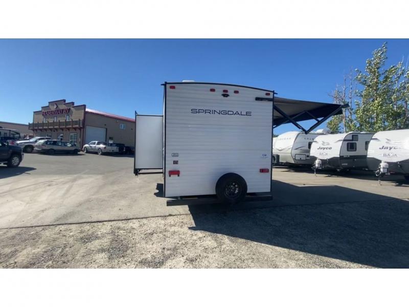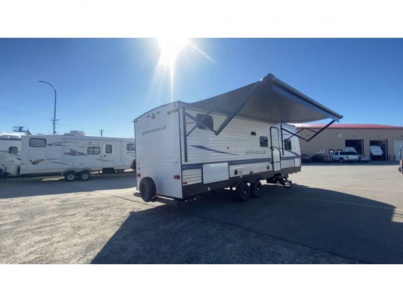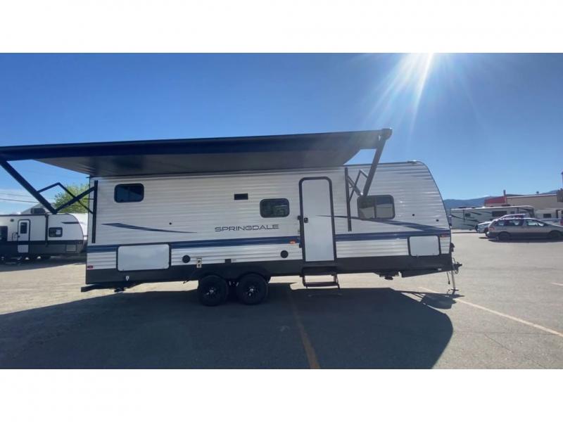 With any Springdale travel trailer by Keystone you will enjoy convenient amenities and comfortable camping features at every turn. The aluminum exterior will be easy to clean, and the power awning provides protection against the hot summer sun. There is also an exterior shower, a friction hinge entry door, and an XL entry assist handle to safely enter and exit the unit. You will find many comforts inside, including a stainless steel sink, ample storage space for your belongings, and cozy sleeping spaces. Start a new adventure today in a Springdale travel trailer!