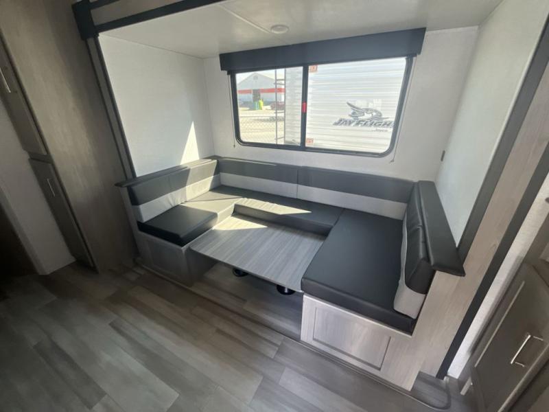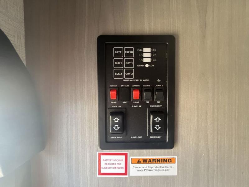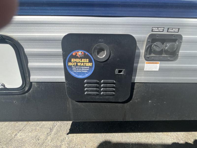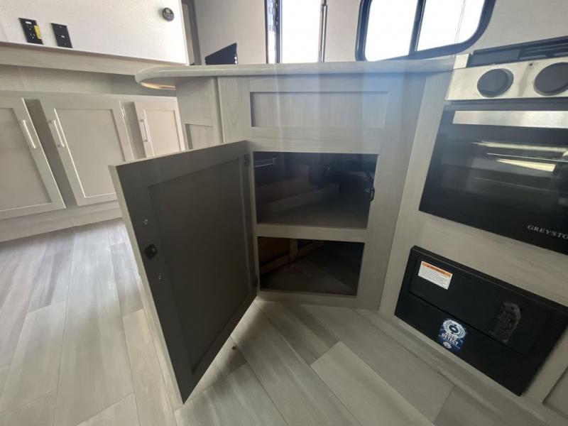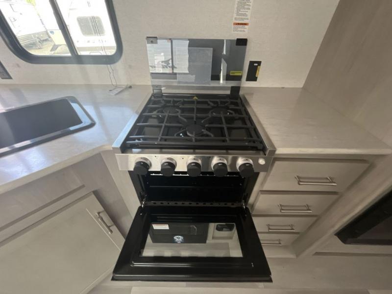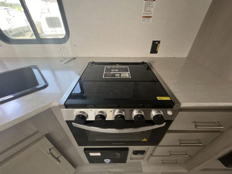 Whether you enjoy camping with your companion or a larger group, you will have plenty of space to call your own and to offer sleeping space for friends and family. There is a private front bedroom with a queen bed and storage for you, a U-shaped dinette slide for eating meals at and sleeping at night when needed, as well as a set of double-size bunks in the rear giving you sleeping space for a total of eight. Outside, you can make meals using the outdoor kitchen, relax under the 18' power awning, and store your camping gear in the pass-through compartment. If you need a little bit more help to create dinner, you can head back inside where you will find a three-burner range with a glass top and more in the full interior kitchen.