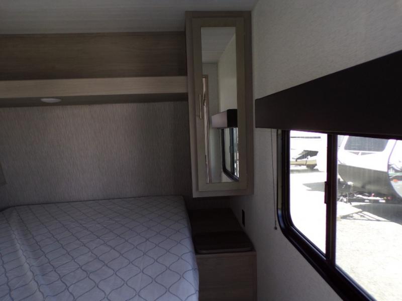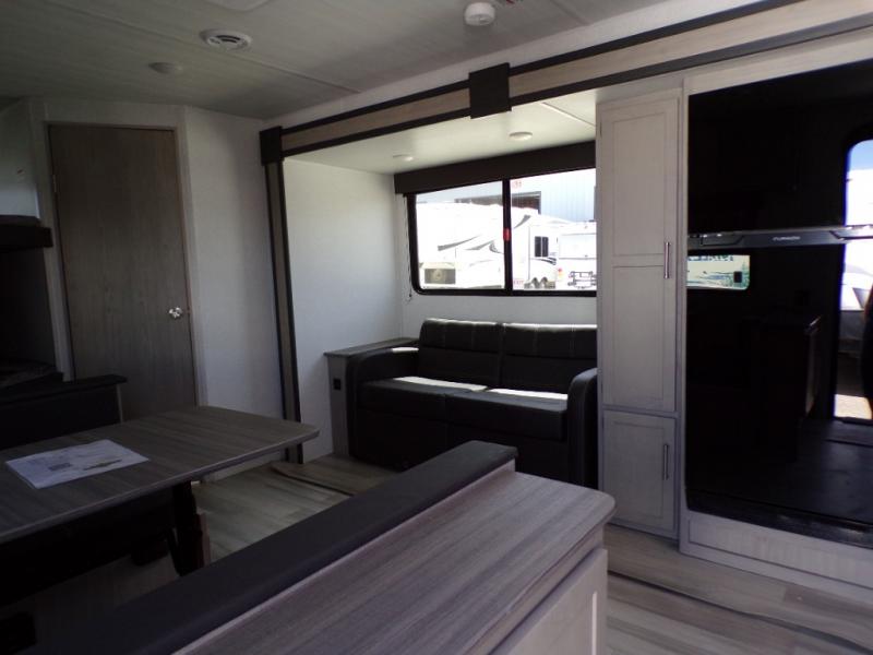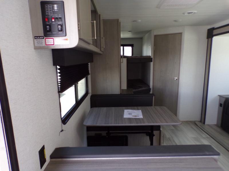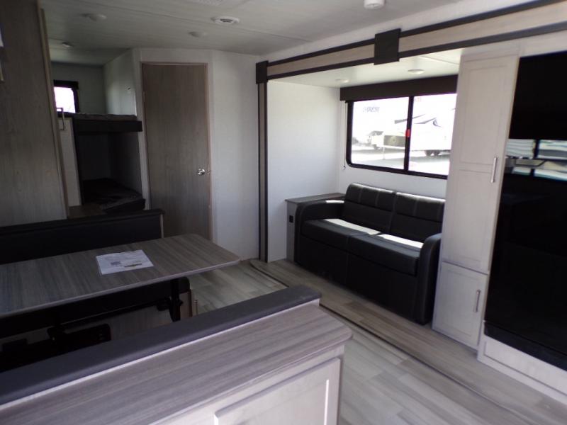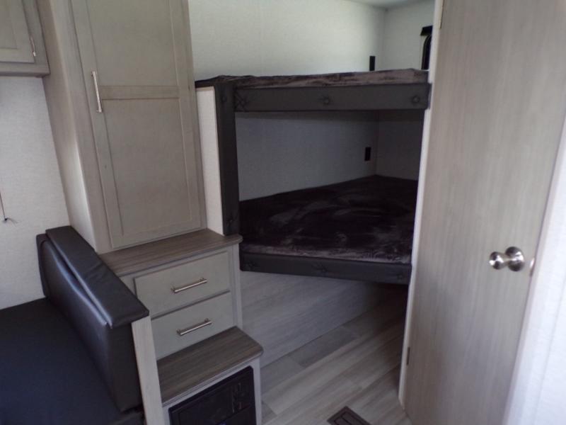 Camping trips in this spacious trailer are sure to bring lasting memories! The little ones or your guests will love the double-size bunks with a flip-up bottom bunk to easily store luggage away. You will have a cozy queen bed in the front bedroom, along with dual closets and nightstands and a laundry chute that will go straight to the pass-through storage. Everyone can meet in the middle living room on the jack knife sofa within the slide out, or you can choose the optional tri-fold sleeper sofa. And don't overlook the full kitchen with a three burner cooktop and 17" oven, microwave oven, and 12V refrigerator. There is even an outdoor griddle and refrigerator so you can grab a cold drink while relaxing under the 14' awning!