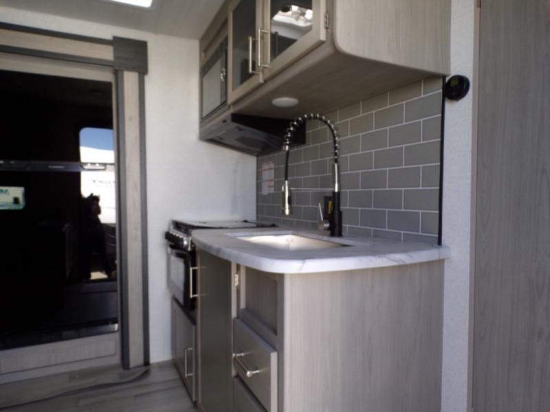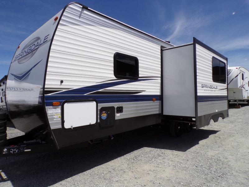 With any Springdale travel trailer by Keystone you will enjoy convenient amenities and comfortable camping features at every turn. The aluminum exterior will be easy to clean, and the power awning provides protection against the hot summer sun. There is also an exterior shower, a friction hinge entry door, and an XL entry assist handle to safely enter and exit the unit. You will find many comforts inside, including a stainless steel sink, ample storage space for your belongings, and cozy sleeping spaces. Start a new adventure today in a Springdale travel trailer!