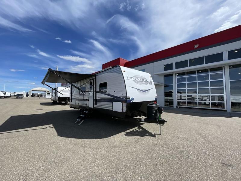 With any Springdale travel trailer by Keystone you will enjoy convenient amenities and comfortable camping features at every turn. The aluminum exterior will be easy to clean, and the power awning provides protection against the hot summer sun. There is also an exterior shower, a friction hinge entry door, and an XL entry assist handle to safely enter and exit the unit. You will find many comforts inside, including a stainless steel sink, ample storage space for your belongings, and cozy sleeping spaces. Start a new adventure today in a Springdale travel trailer!