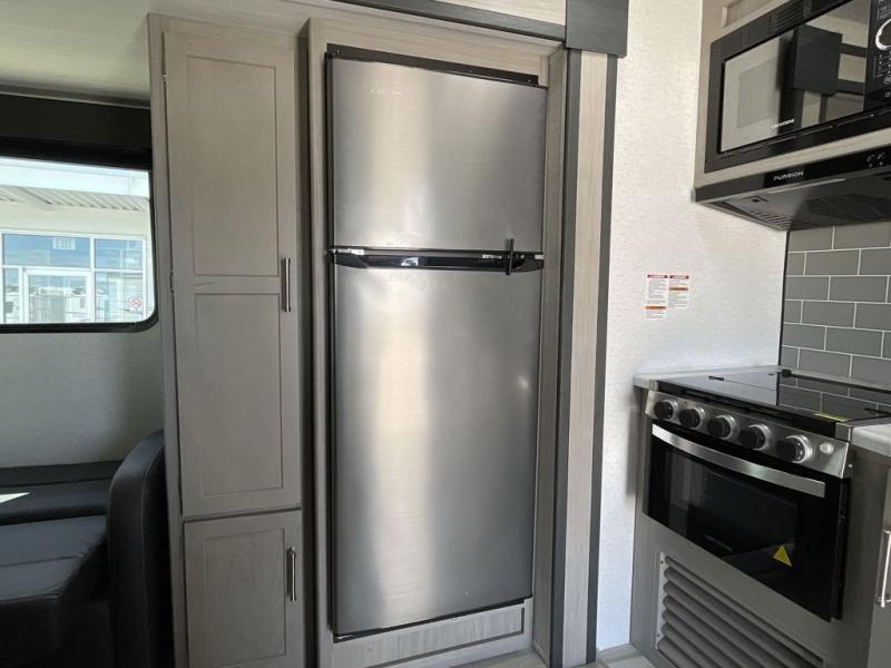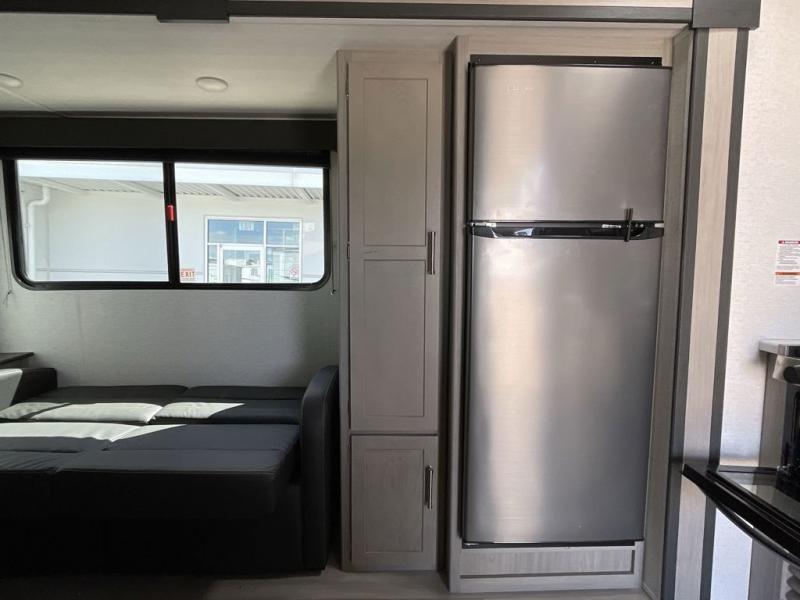 Camping trips in this spacious trailer are sure to bring lasting memories! The little ones or your guests will love the double-size bunks with a flip-up bottom bunk to easily store luggage away. You will have a cozy queen bed in the front bedroom, along with dual closets and nightstands and a laundry chute that will go straight to the pass-through storage. Everyone can meet in the middle living room on the jack knife sofa within the slide out, or you can choose the optional tri-fold sleeper sofa. And don't overlook the full kitchen with a three burner cooktop and 17" oven, microwave oven, and 12V refrigerator. There is even an outdoor griddle and refrigerator so you can grab a cold drink while relaxing under the 14' awning!