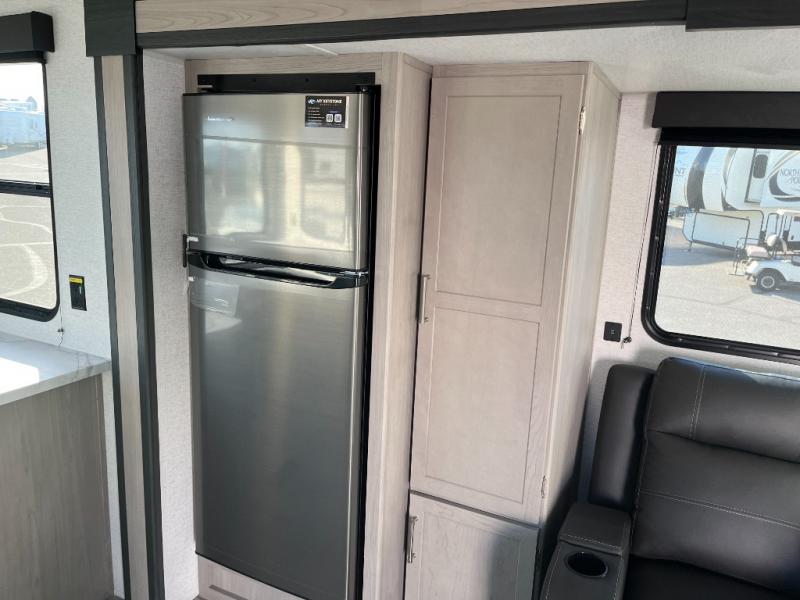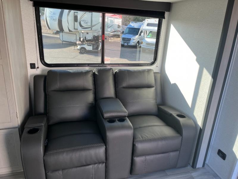 Enjoy all of your camping excursions in this rear kitchen, double slide unit. The rear kitchen features nice countertop space, plus a great view out the window in back. Dual slides opposite each other creates an open concept feel in this combined kitchen/living area featuring comfortable theater seating, a large U-shaped dinette, plus a corner entertainment center. There are also two pantries to hold all of your dry goods. Up front, you will appreciate the private bedroom featuring a queen bed with dual closets, overhead cabinets and a shelf for your things. The walk-through bath is spacious as it is the entire width of the unit and provides a nice shower, toilet, sink and closet. Outside, enjoy the 12' awning that offers added living space and a front pass-through storage compartment will easily house all of your outdoor camping gear.