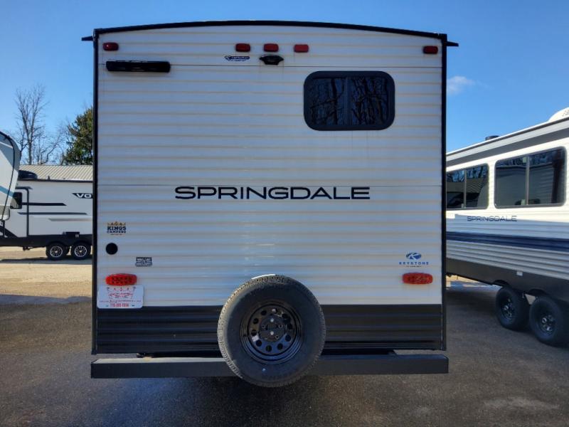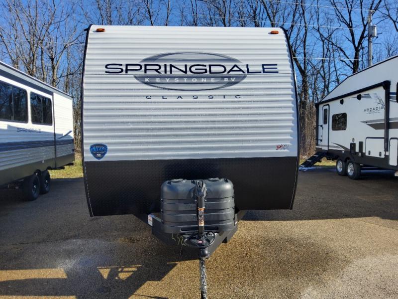 The Springdale Classic travel trailers by Keystone will provide you and your family many great outdoor experiences and it will also be kind to your pocketbook. Each one is constructed with an aluminum exterior, a walkable roof, and an I-beam frame with stamped steel cross-members and outriggers for added strength. There are also electric stabilizer jacks and power tongue jacks outside, along with a friction hinge entry door and an XL entry assist handle for added convenience. Each travel trailer includes a two burner flush mount gas range with a glass cover, LED lighting, bedside outlets, and blackout night shades inside that will provide you with more privacy at night. Some of the Keystone Exclusives you'll appreciate are the color-coded unified wiring and in-floor heating ducts, and the optional SolarFlex 200 will let you add off-grid capabilities if you choose!