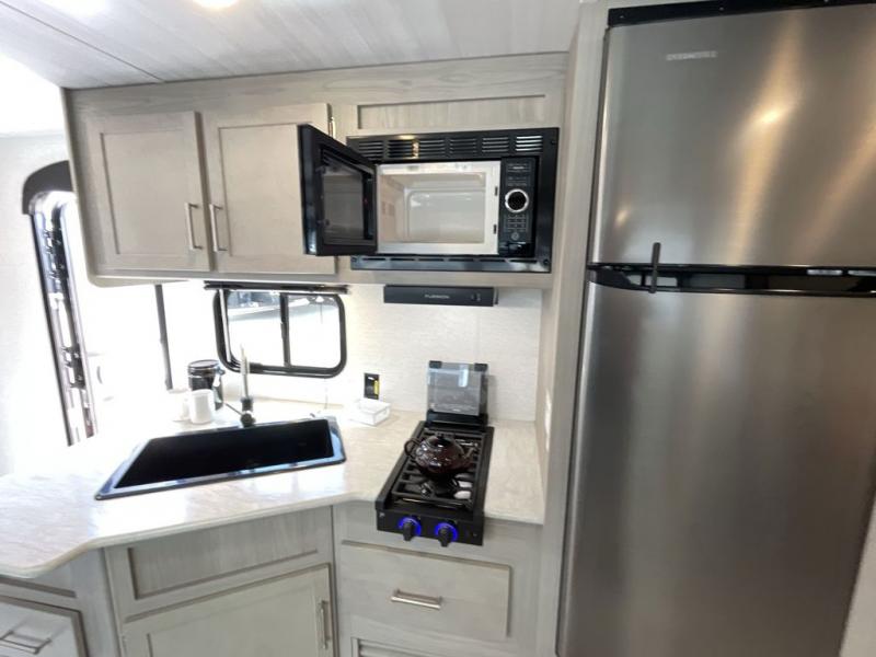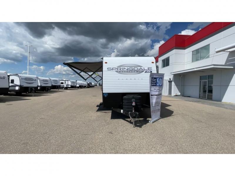 The Springdale Classic travel trailers by Keystone will provide you and your family many great outdoor experiences and it will also be kind to your pocketbook. Each one is constructed with an aluminum exterior, a walkable roof, and an I-beam frame with stamped steel cross-members and outriggers for added strength. There are also electric stabilizer jacks and power tongue jacks outside, along with a friction hinge entry door and an XL entry assist handle for added convenience. Each travel trailer includes a two burner flush mount gas range with a glass cover, LED lighting, bedside outlets, and blackout night shades inside that will provide you with more privacy at night. Some of the Keystone Exclusives you'll appreciate are the color-coded unified wiring and in-floor heating ducts, and the optional SolarFlex 200 will let you add off-grid capabilities if you choose!
