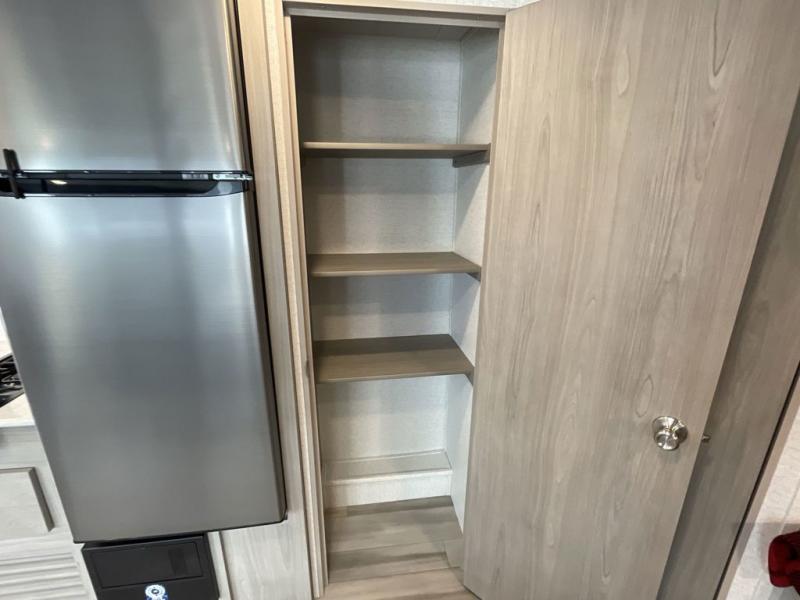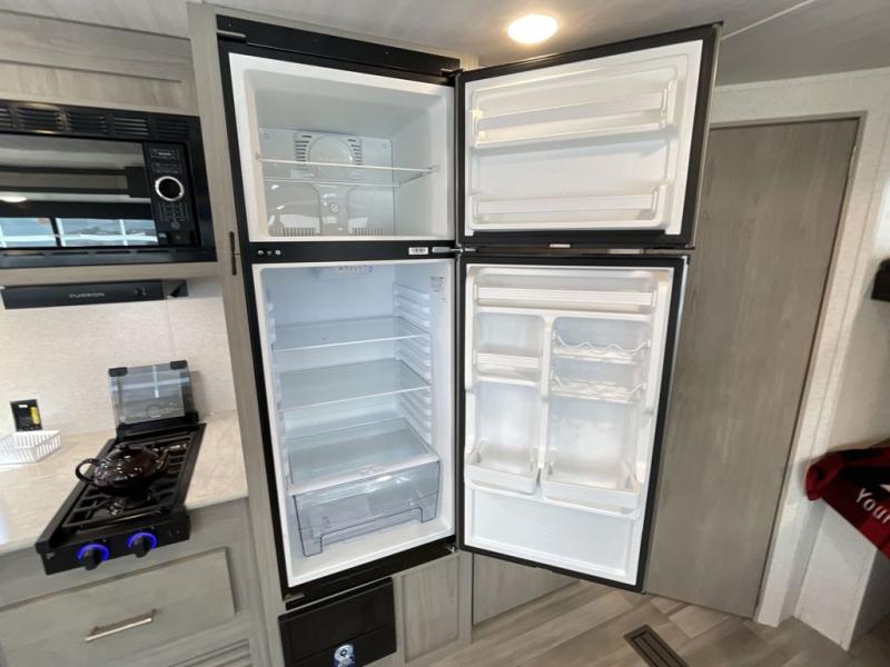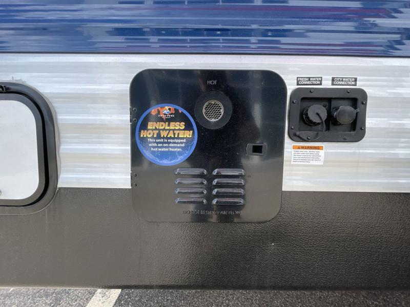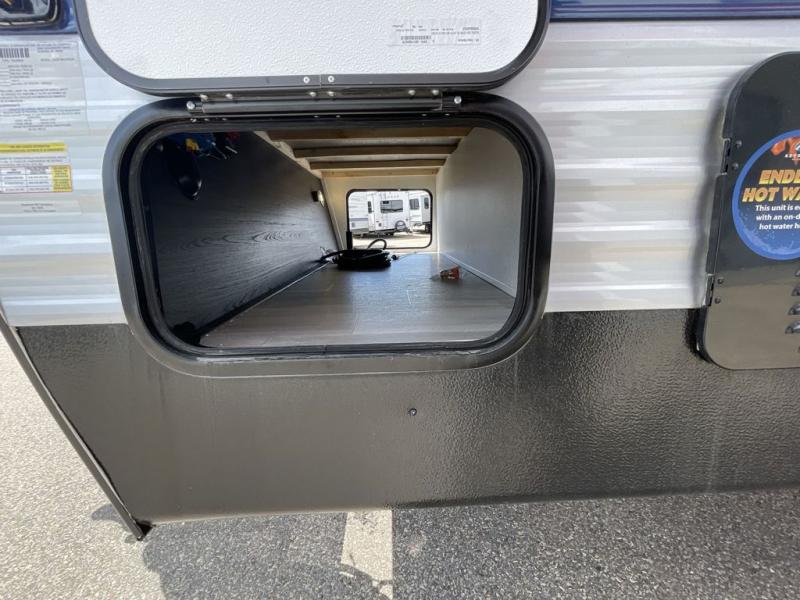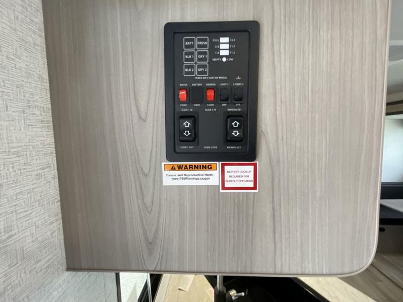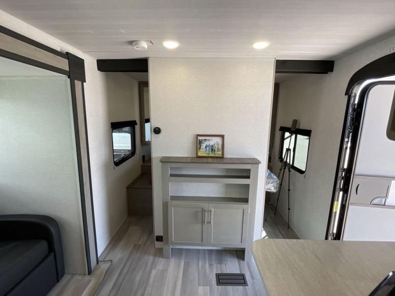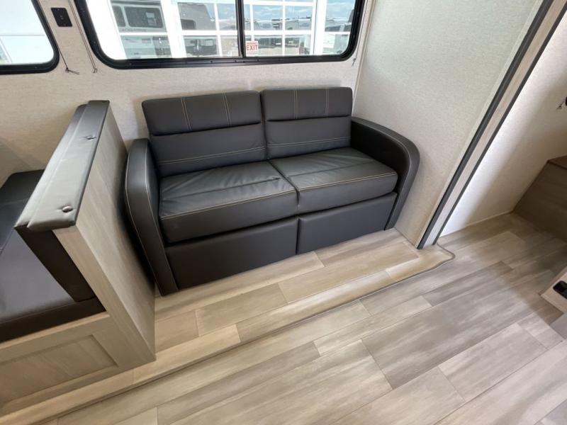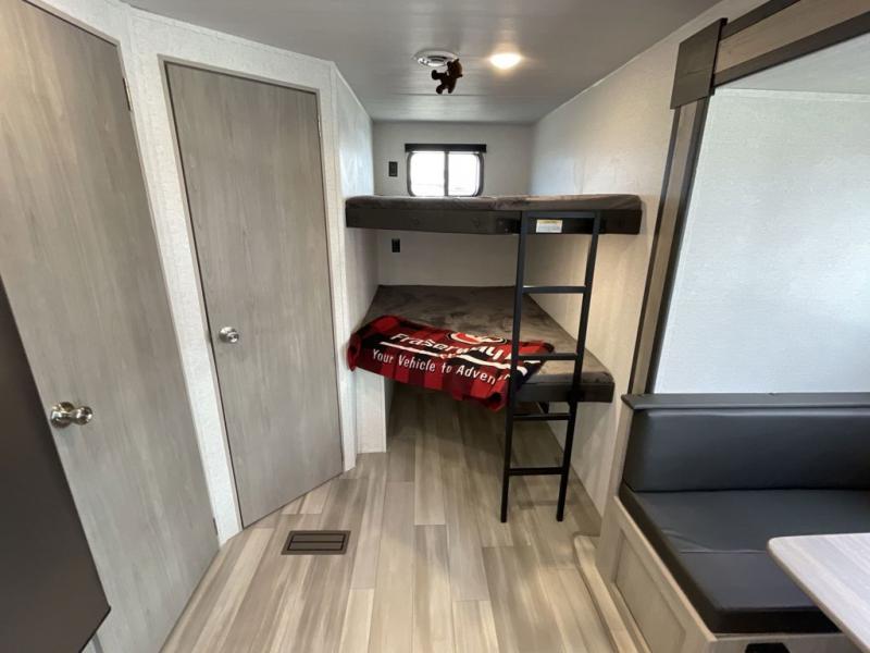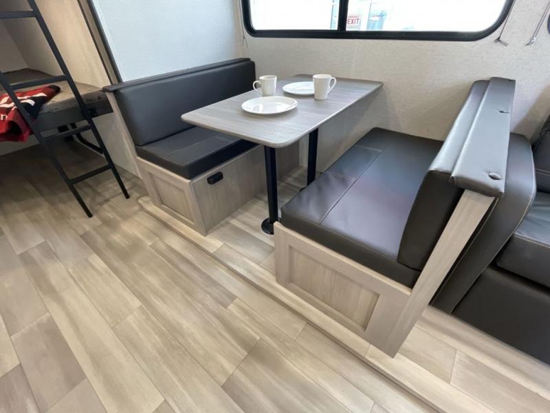 You'll have additional space to stretch out in this travel trailer for eight to ten! Within the super slide you'll find the booth dinette and sofa that will be perfect for meal times, relaxing, and sleeping more guests, and there is an entertainment with TV prep for movie nights. The little ones will love the double-size bunks, and the full bath is close by for easy nighttime use. You'll have the front private bedroom with a queen bed all to yourselves, plus there are dual closets and nightstands for your things. This model also includes an exterior pass-through storage outside and a 16' power awning for protection against the sun!