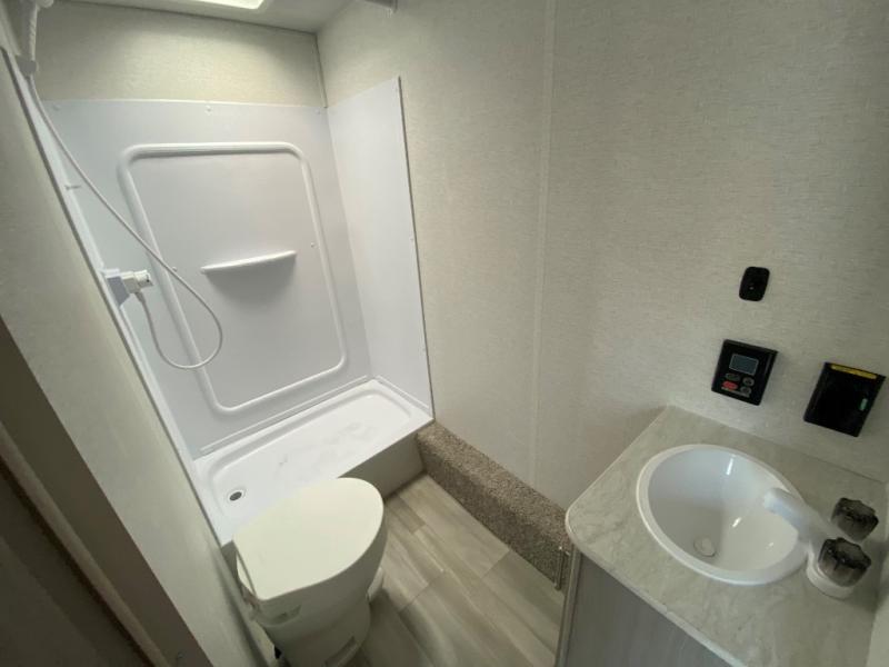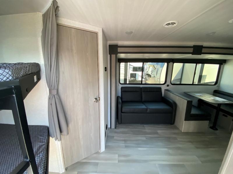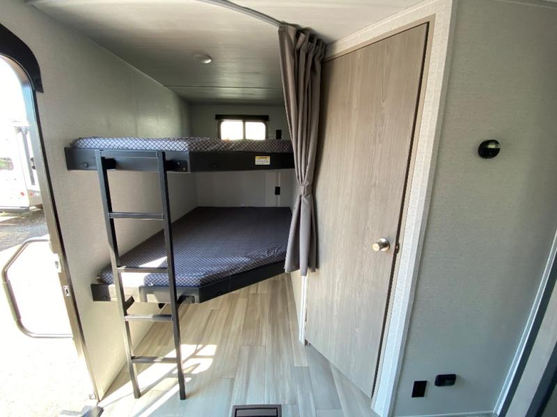 What could be better than camping with double-size bunks for guests? How about a front private bedroom for you, a full bath to clean up in, and a super slide out for maximum space! The chef of your group can prepare breakfast on the two burner gas range in the morning, or use the .9 cu. ft. microwave if you're on the go. There is a booth dinette to dine at, or you can take your plate outdoors to sit under the power awning.