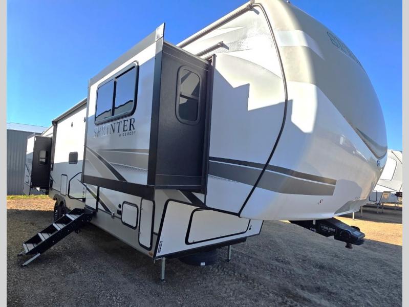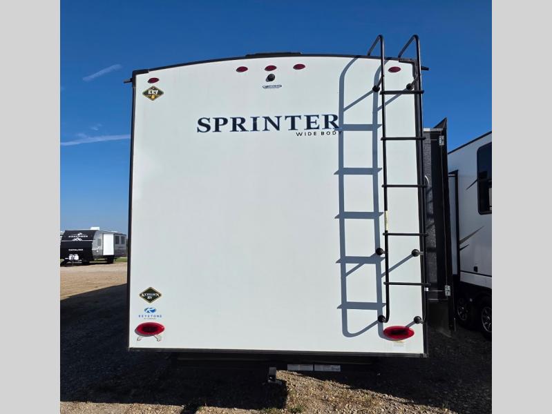 This Sprinter Limited fifth wheel is yours for the taking! You can enter through an XL 30" friction-hinge entry door to find a great kitchen decked out with a range with a glass top, a 30" microwave, a breakfast bar, a 16-cubic foot refrigerator, a pantry, and a hutch. After you whip up dinner and a fabulous dessert, you can enjoy them at the wall-mounted dinette with four chairs. The separate living room has a residential feel with its fireplace, 50" LED HDTV, two queen-size tri-fold sofas, and full-reclining theater seating with massage, lights, and USB. If you find yourself tired out from the day's travels, you can head straight to the rear private bedroom to fall asleep on the king-size bed after taking a hot shower in the residential shower.