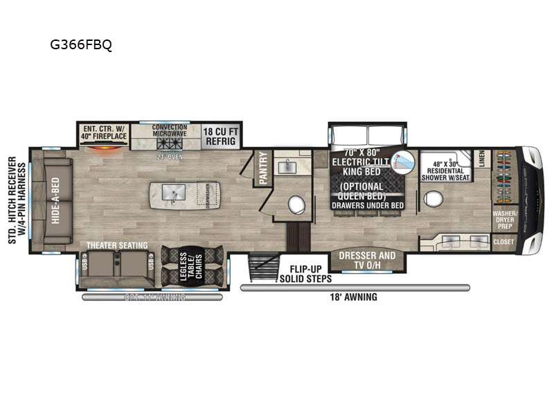 With any KZ Durango Gold full-time luxury fifth wheel, you will enjoy the look of modern farmhouse cabinetry, upgraded kitchen appliances such as a 30" convection microwave and 24" oven with four burner range, plus a stainless dishwasher. Other top features include an electric tilt bed with Serta Comfort foam king mattress, theater seating with cupholders and a USB plug, plus heat, massage, and power recline/decline features. You will also appreciate a handy central vacuum system with multiple attachments that stores out of sight. Each Durango Gold is constructed with six-sided aluminum framing, and has heated, insulated and an enclosed underbelly. It is also constructed with Tufflex roofing material which is flexible, puncture resistant, and reflective. Some additional standout features include a fully-vented attic system, and a Durango Towing package which includes a 2" towing receiver hitch with 4-pin wire harness connection. This will provide you with 3,000 lbs. of towing capacity. Come choose your favorite lightweight high-profile wide body luxury fifth wheel today!