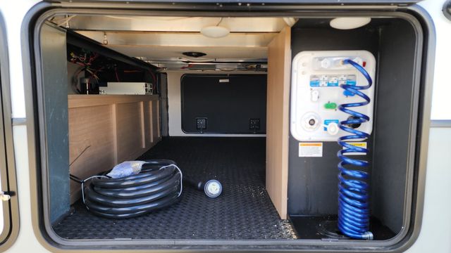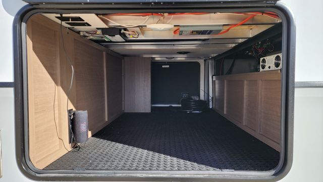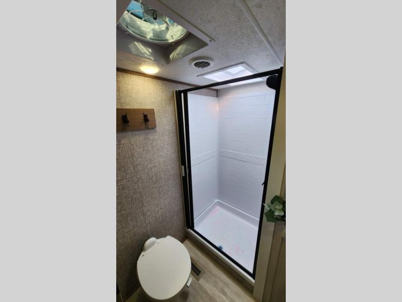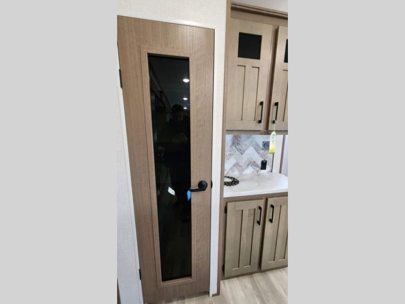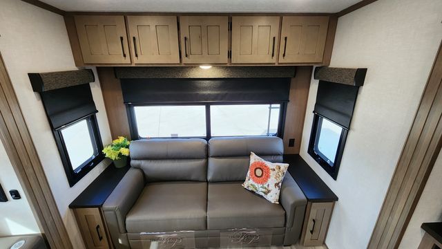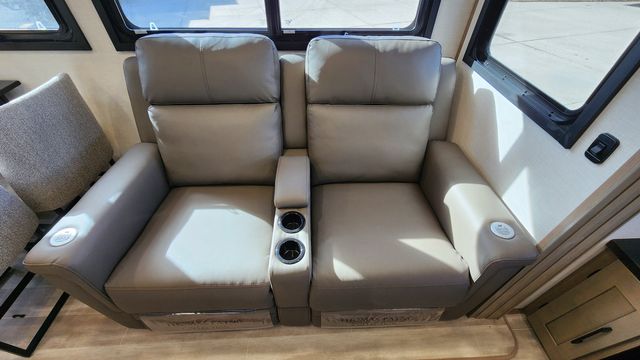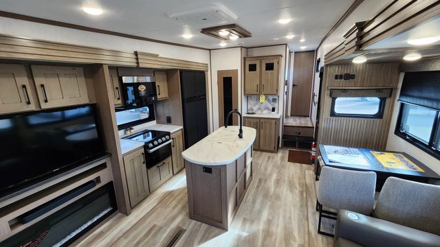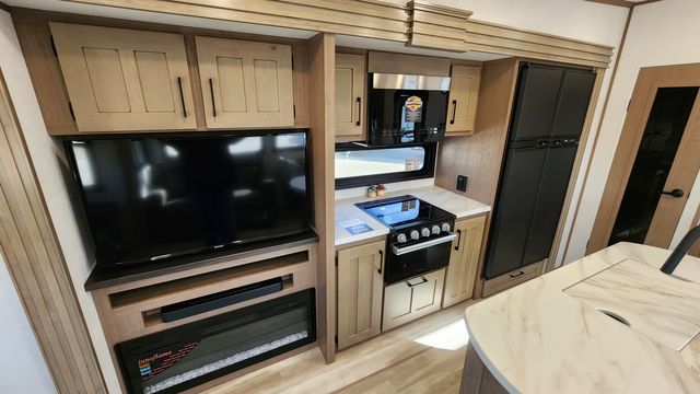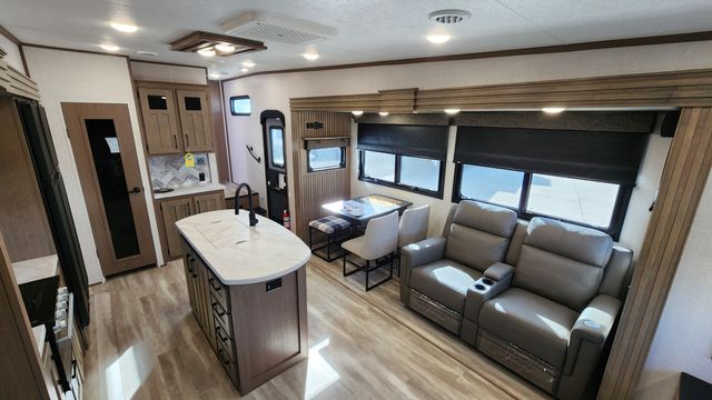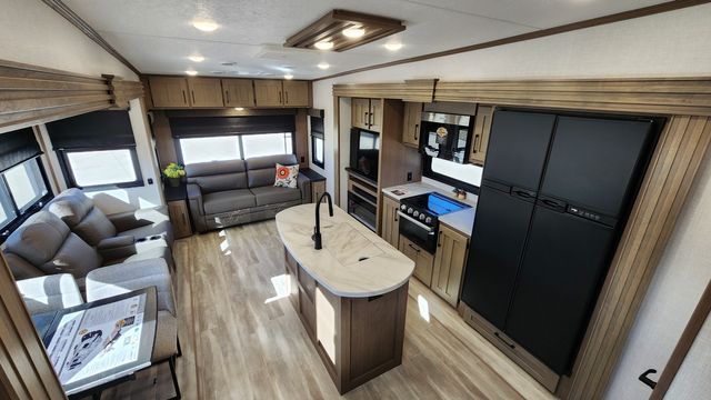 This fifth wheel will feel just like home with its kitchen island, theater seating, and front private bedroom! If you have any overnight guests, they can sleep on the rear hide-a-bed sofa. There is also a legless table, chairs, and a bench for dining space, an entertainment center with a 43" Smart LED TV and an optional 40" fireplace. You will love the extra features that have been added, like the hutch in the kitchen for extra counter and storage space, the shower skylight in the spacious full bath, and the slide out wardrobe in the front bedroom!