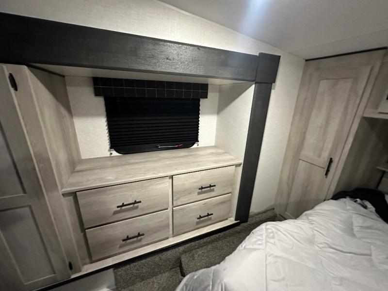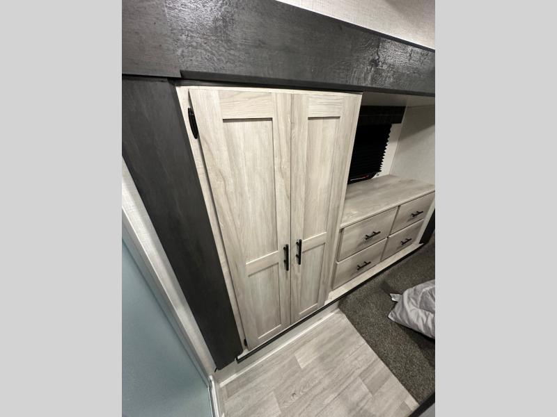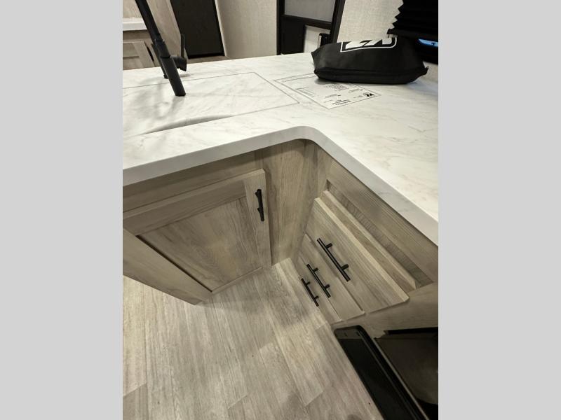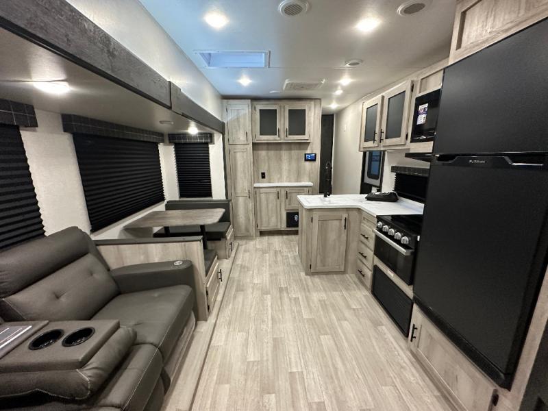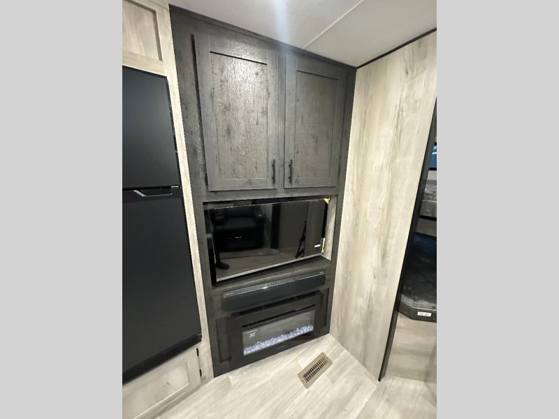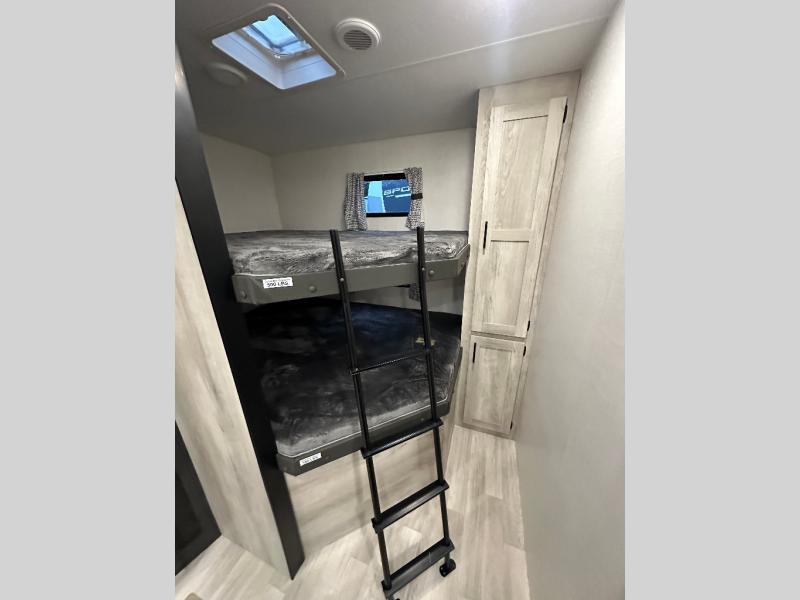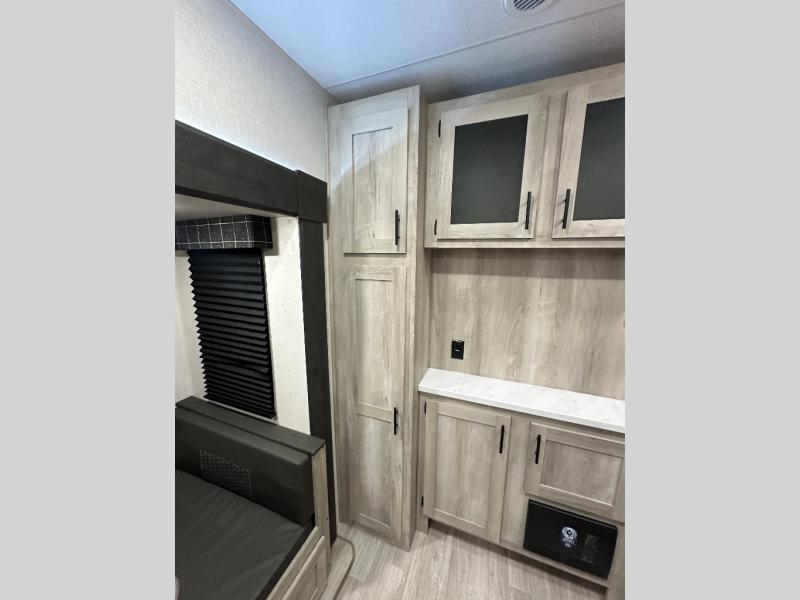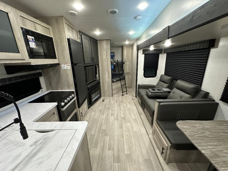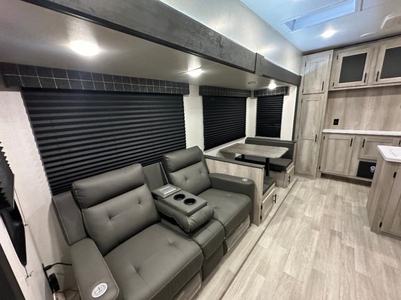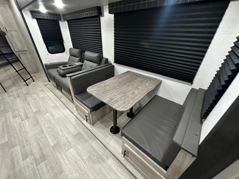 Everyone will have a comfortable place to lay their head at night with this fifth wheel! The rear corner set of queen bunk beds have a wardrobe next to it, and the front private bedroom has a queen bed with wardrobes on either side, a slide with drawers and a wardrobe, and an entrance into the dual entry bathroom. Store your dishes in the hutch, cook your meals with the three burner cooktop, and enjoy them at the 42" booth dinette. You could even breathe in some fresh air while you cook dinner at the outside griddle. The hide-a-bed sofa with optional theater seating is a great place for an afternoon nap, as well as an extra sleeping space at night. With two exterior pass-through storage areas, you will have plenty of space for all of your outdoor gear!