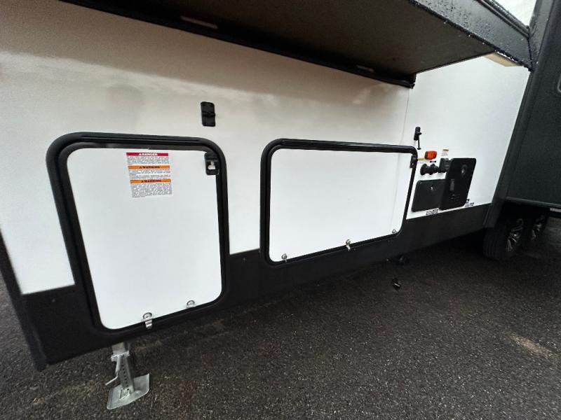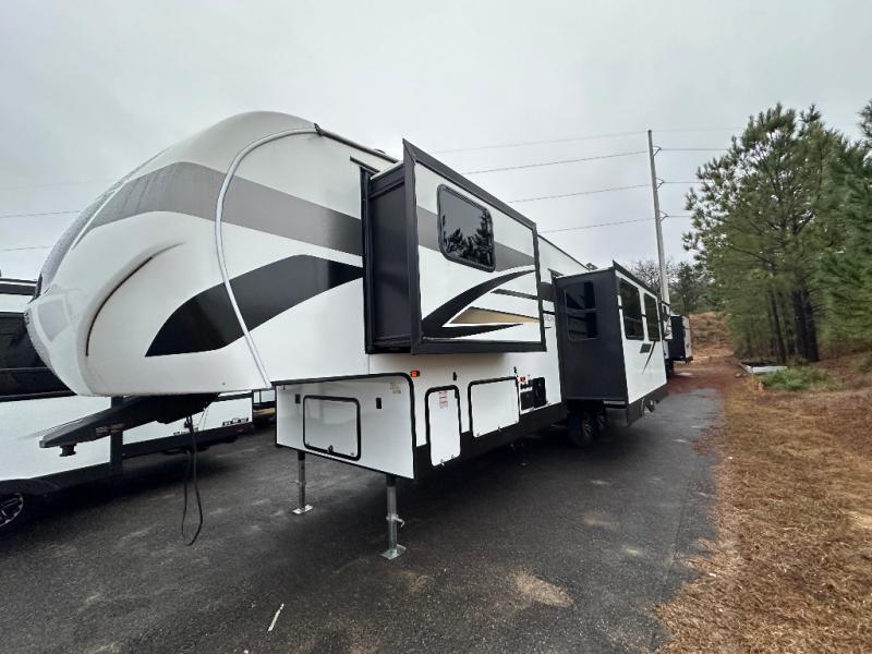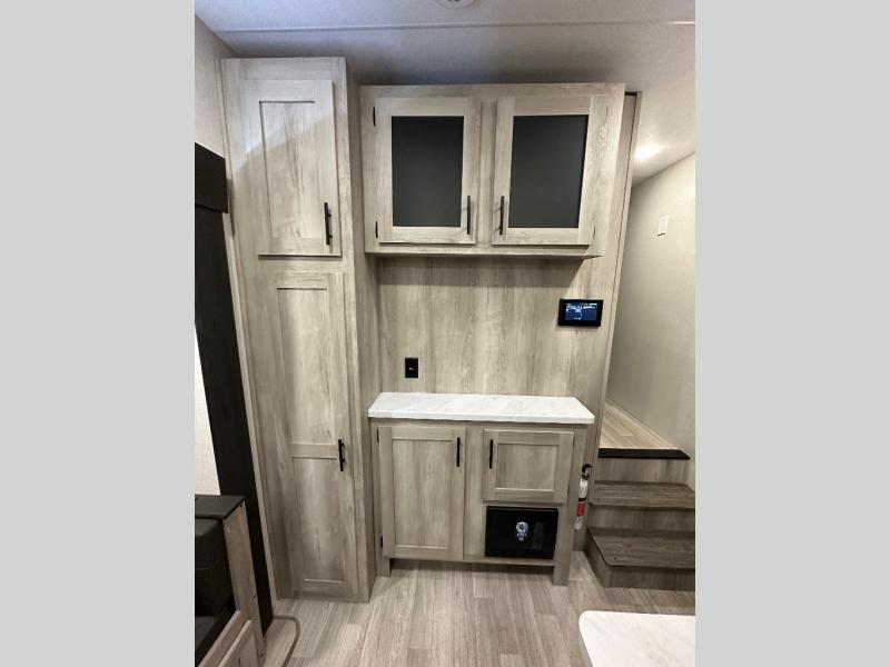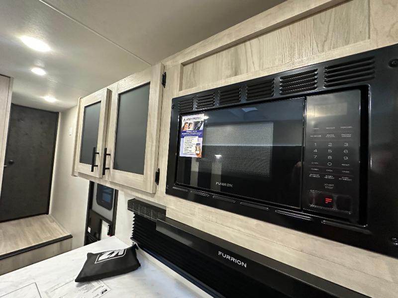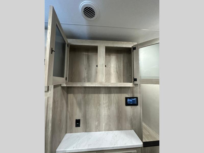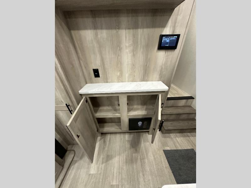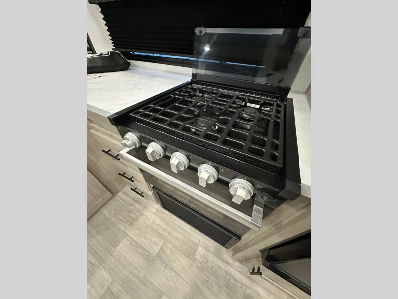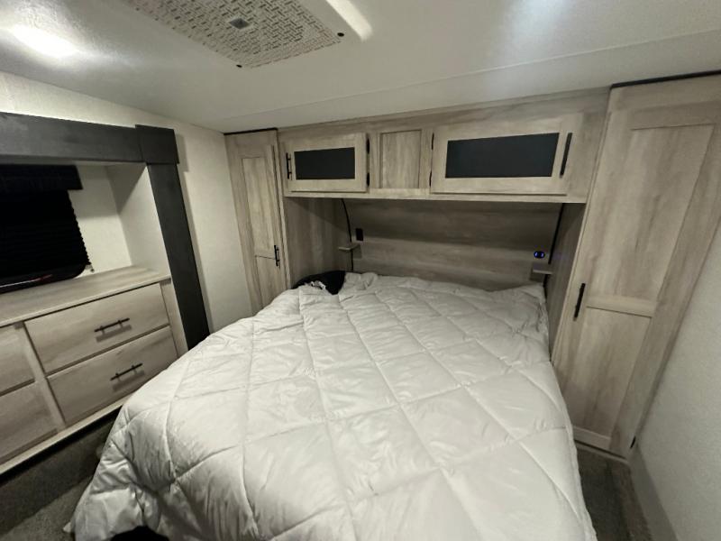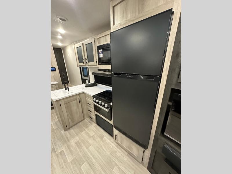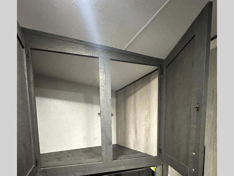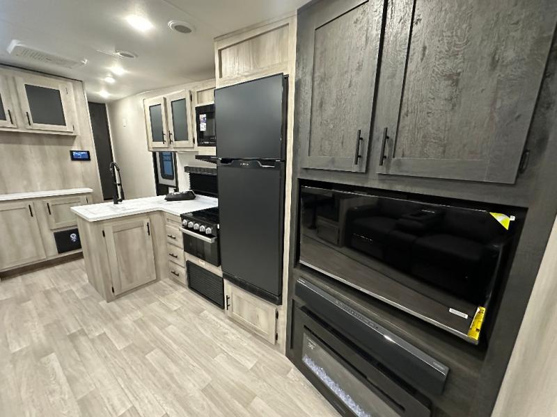 Everyone will have a comfortable place to lay their head at night with this fifth wheel! The rear corner set of queen bunk beds have a wardrobe next to it, and the front private bedroom has a queen bed with wardrobes on either side, a slide with drawers and a wardrobe, and an entrance into the dual entry bathroom. Store your dishes in the hutch, cook your meals with the three burner cooktop, and enjoy them at the 42" booth dinette. You could even breathe in some fresh air while you cook dinner at the outside griddle. The hide-a-bed sofa with optional theater seating is a great place for an afternoon nap, as well as an extra sleeping space at night. With two exterior pass-through storage areas, you will have plenty of space for all of your outdoor gear!