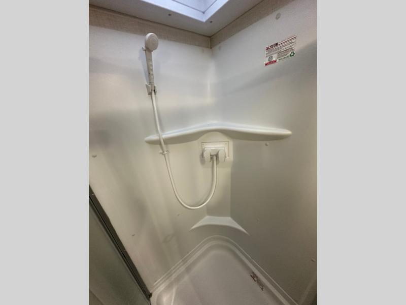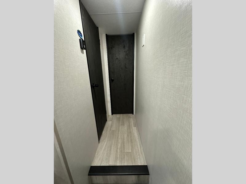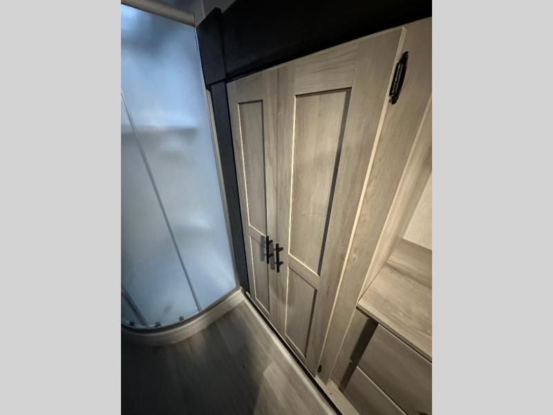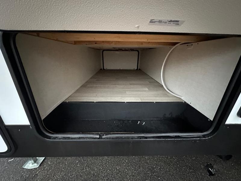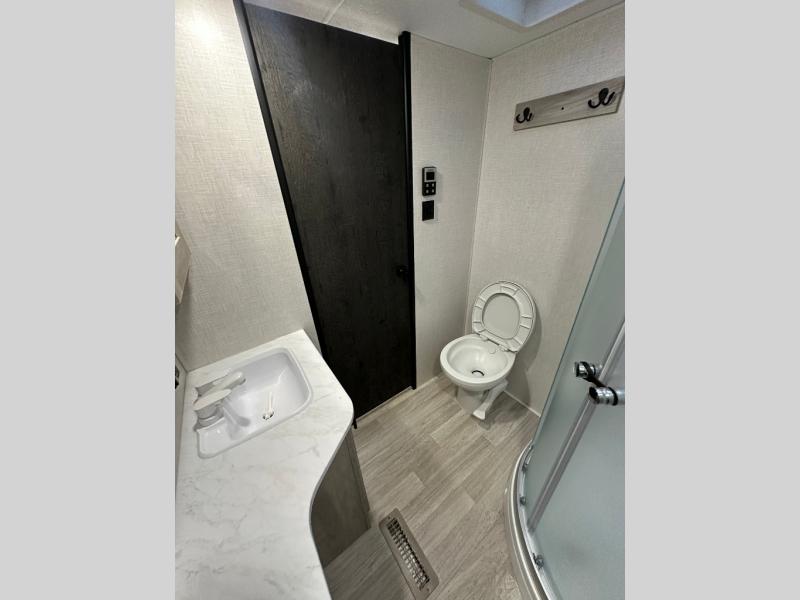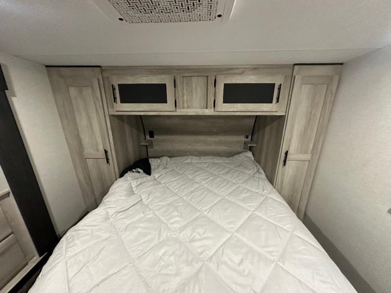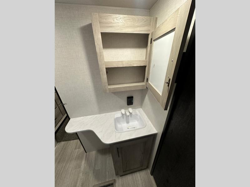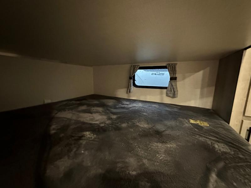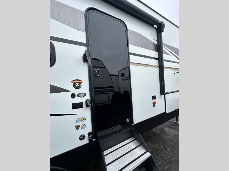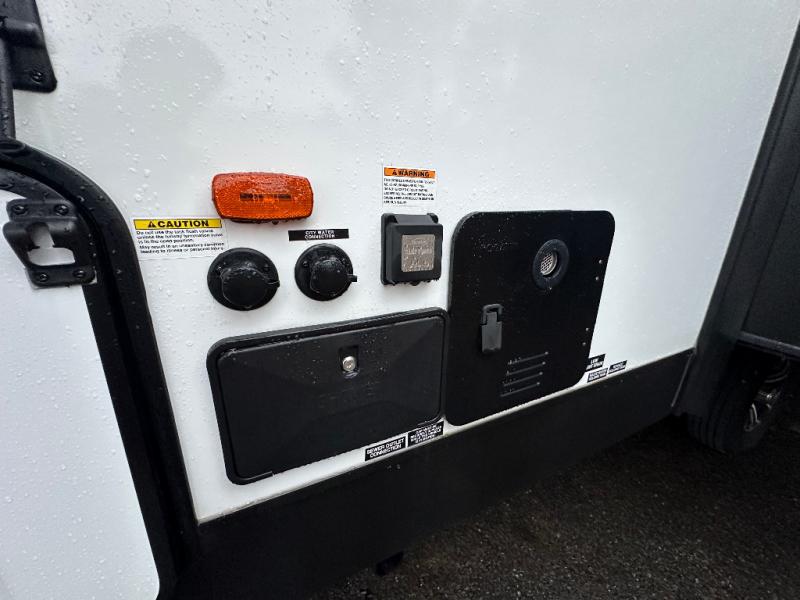 Everyone will have a comfortable place to lay their head at night with this fifth wheel! The rear corner set of queen bunk beds have a wardrobe next to it, and the front private bedroom has a queen bed with wardrobes on either side, a slide with drawers and a wardrobe, and an entrance into the dual entry bathroom. Store your dishes in the hutch, cook your meals with the three burner cooktop, and enjoy them at the 42" booth dinette. You could even breathe in some fresh air while you cook dinner at the outside griddle. The hide-a-bed sofa with optional theater seating is a great place for an afternoon nap, as well as an extra sleeping space at night. With two exterior pass-through storage areas, you will have plenty of space for all of your outdoor gear!