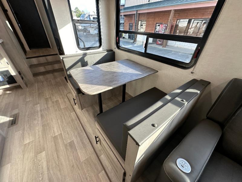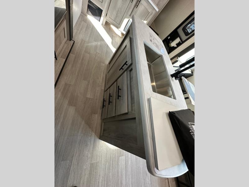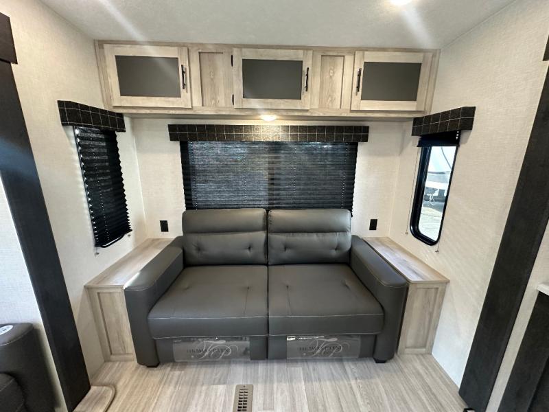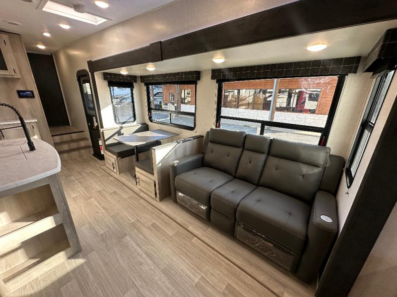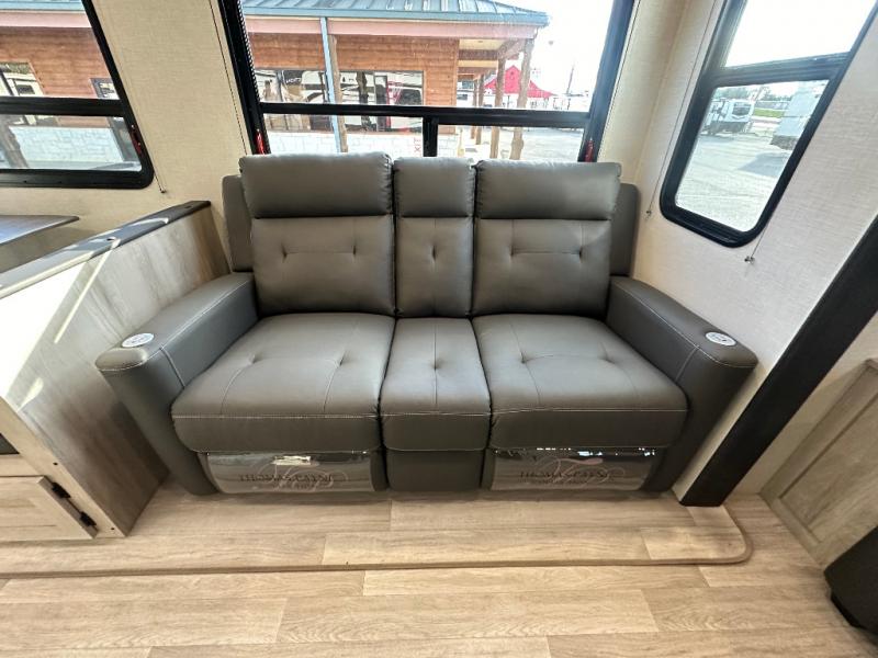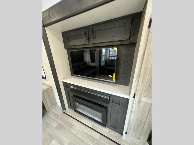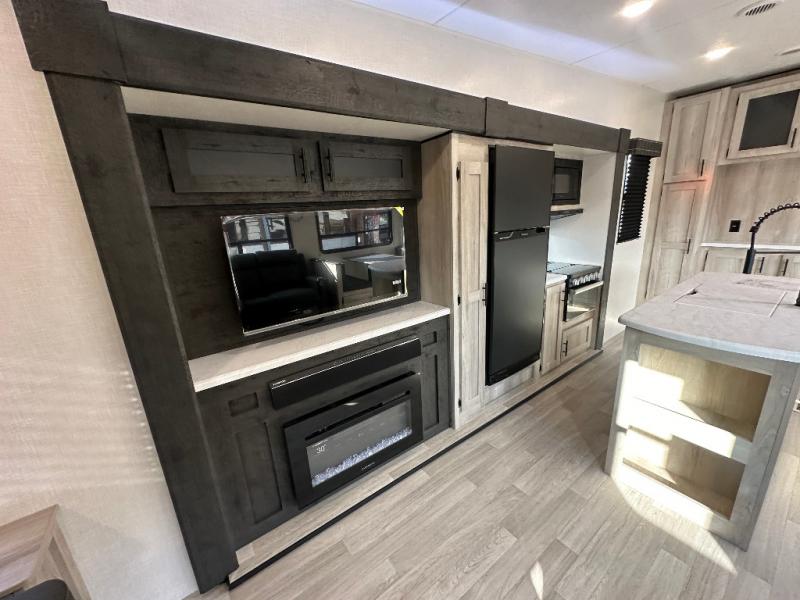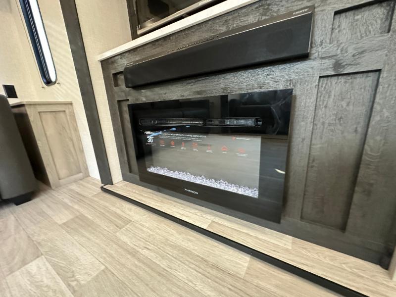 You won't want to camp any other way once you see what this fifth wheel has to offer! The front private bedroom has a queen bed with a slide that has drawers and a wardrobe, as well as an entrance into the dual entry bathroom which has a radius shower to freshen up in each morning. The chef can prepare their best meals with the kitchen island and three burner cooktop, plus store their dishes in the hutch, and snacks in the pantry. Pop a bag of popcorn in the microwave to enjoy while you watch your favorite movie on the LED TV and you can choose to add the optional 30" fireplace to the entertainment center. The rear 70" tri-fold sofa has end tables to set your drinks on and the theater seating has USB ports to charge your phones too!