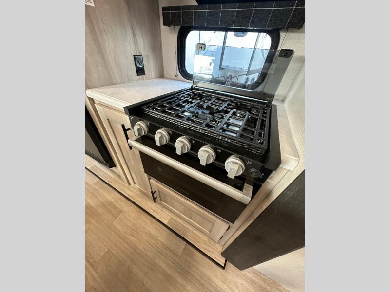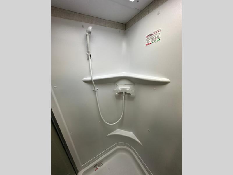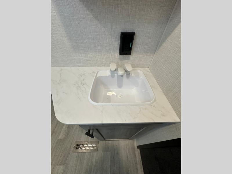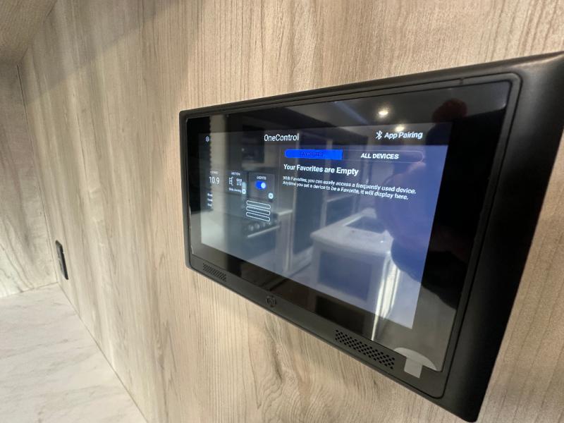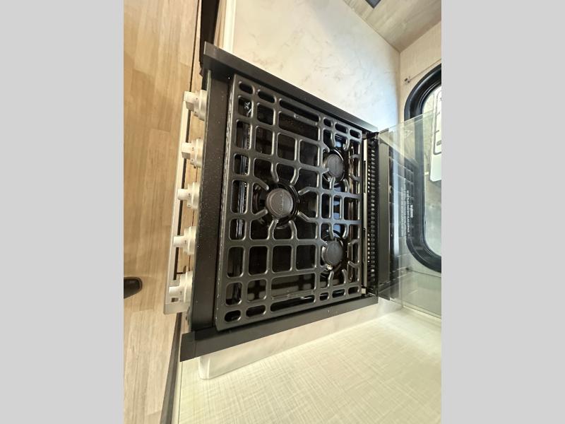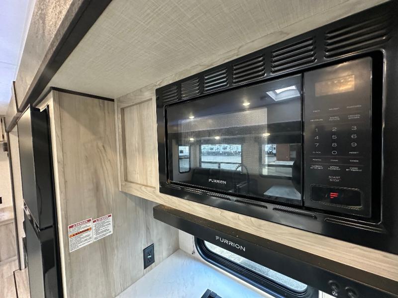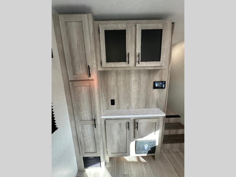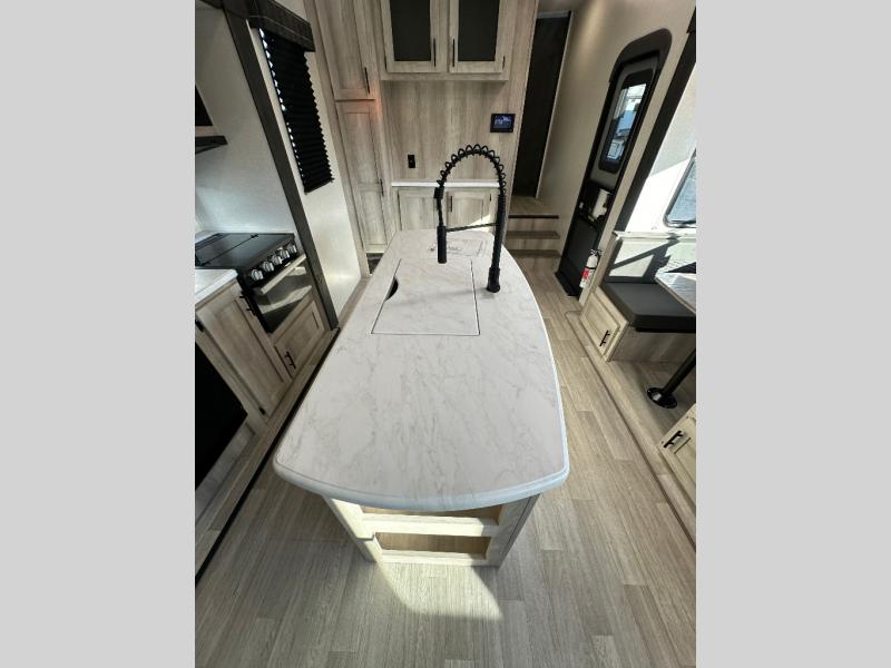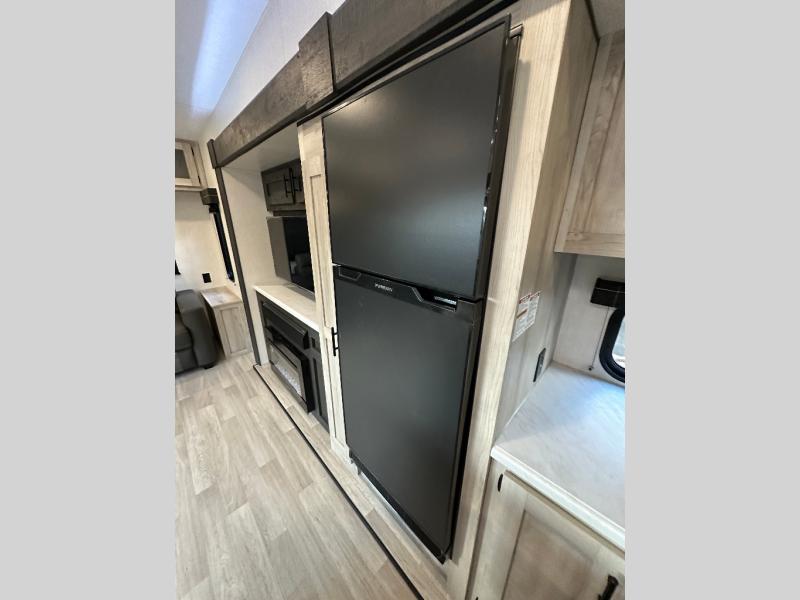 You won't want to camp any other way once you see what this fifth wheel has to offer! The front private bedroom has a queen bed with a slide that has drawers and a wardrobe, as well as an entrance into the dual entry bathroom which has a radius shower to freshen up in each morning. The chef can prepare their best meals with the kitchen island and three burner cooktop, plus store their dishes in the hutch, and snacks in the pantry. Pop a bag of popcorn in the microwave to enjoy while you watch your favorite movie on the LED TV and you can choose to add the optional 30" fireplace to the entertainment center. The rear 70" tri-fold sofa has end tables to set your drinks on and the theater seating has USB ports to charge your phones too!