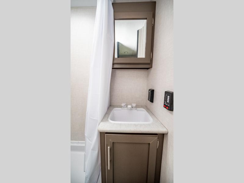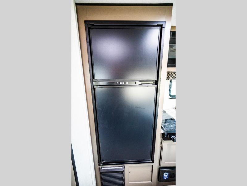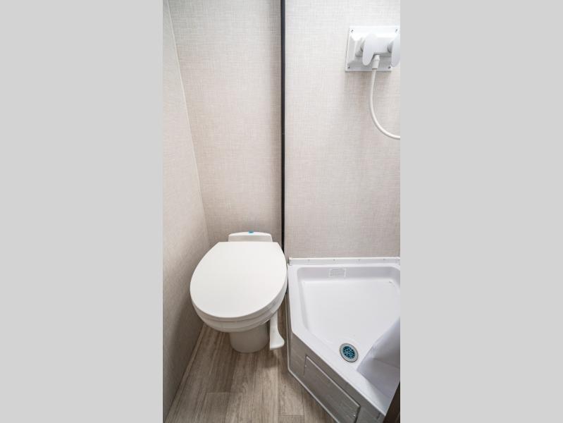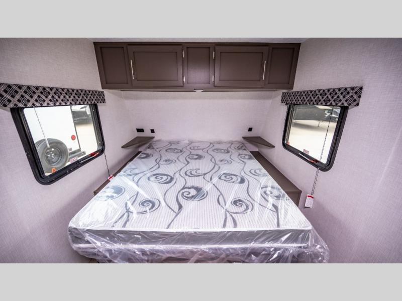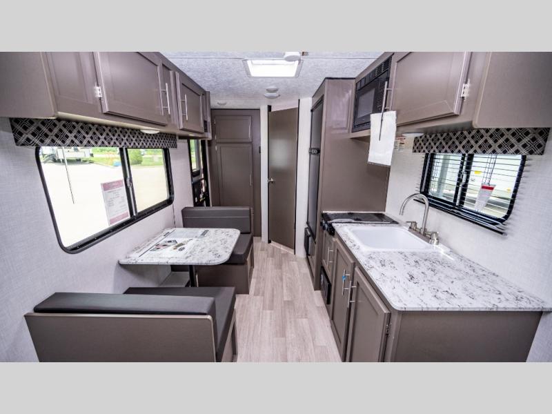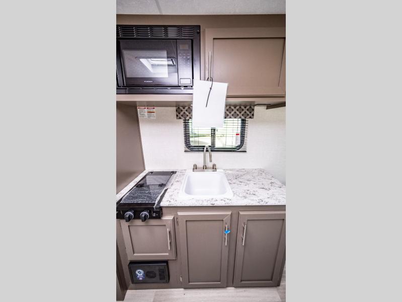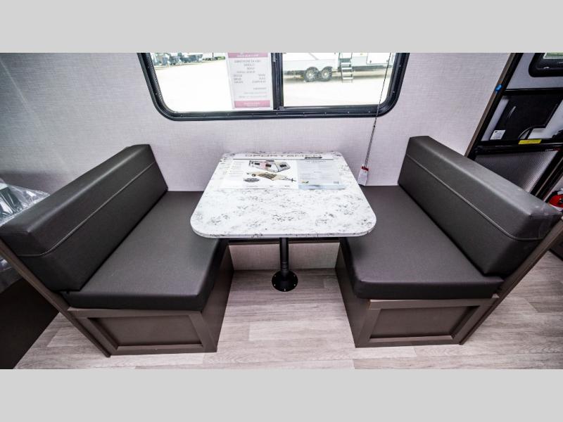 This travel trailer will feel just like home with its full bath, walk-around queen bed, and plenty of storage space for your belongings. Once you arrive at the campground, grab your fishing poles from the pass-through storage and head down to the river. You can get cleaned up in the full bath before heading to the kitchen to prepare a meal on the two burner cooktop with a glass cover or in the microwave oven. There is a comfortable booth dinette to dine at, and this space can double as sleeping space for overnight guests or two little ones.