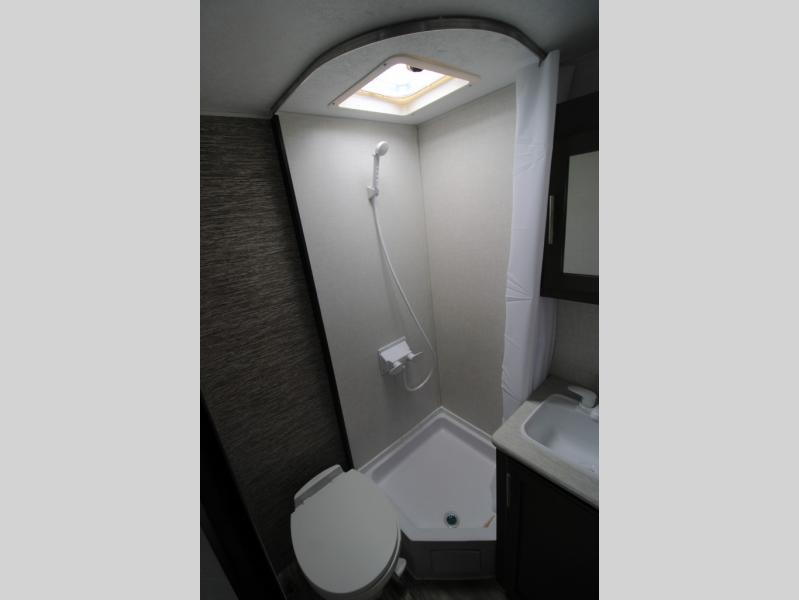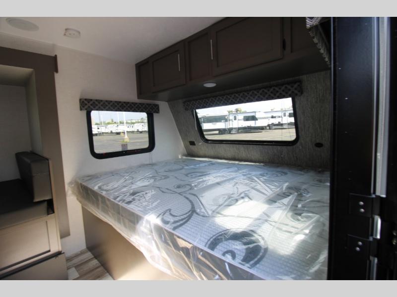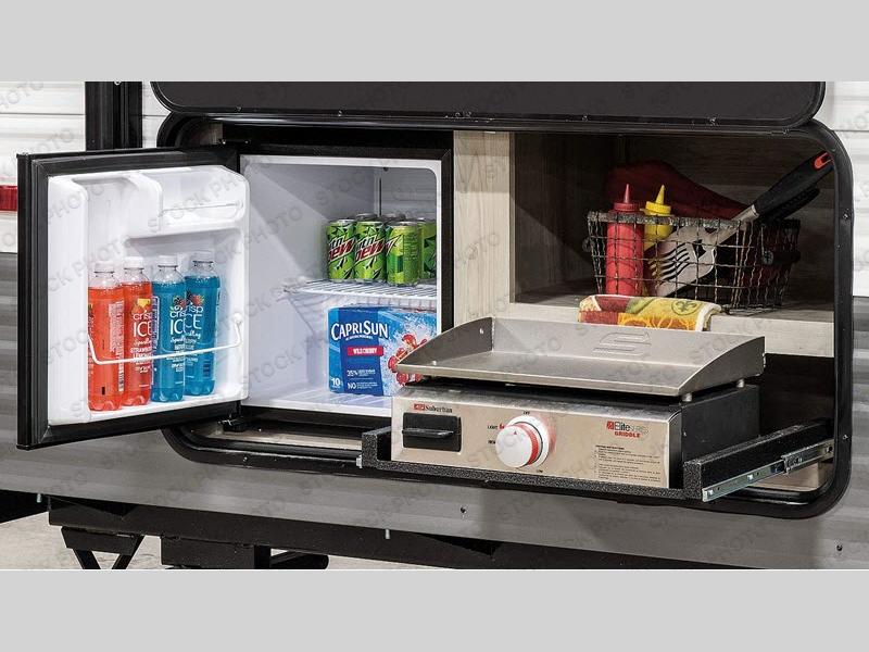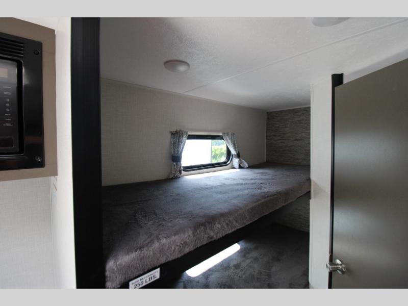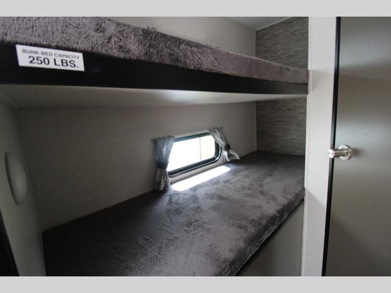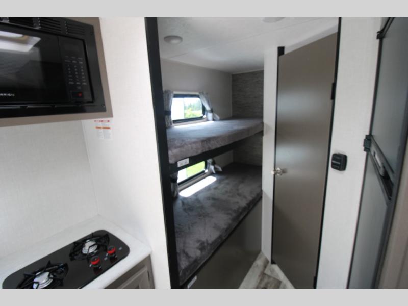 You're going to love camping in this spacious travel trailer that can sleep five people each night. When you arrive at your destination, set up the 14' power awning and start lunch on the outside kitchen. The little ones will love the bunk beds, and you will have the front RV queen bed all to yourselves. This model also includes a full bath that will allow you to stay clean!