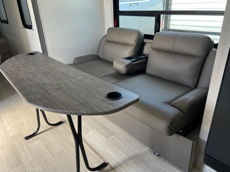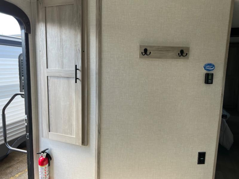 This couple's trailer is perfect to take on weekend excursions or campgrounds across the country. You will feel more at home with your own private bedroom in the back that includes a comfy queen bed and dual shirt closets to keep your clothes wrinkle-free. The full bath is close by for convenience, and here you'll find a shower surround, a foot-flush toilet, and a linen closet for clean towels. Head to the main living area to relax on the jackknife sofa within the slide out. You can dine at the dinette in front of the sofa, and if you have an overnight guest they can sleep here. This model also includes a spacious front kitchen with tons of counter space, plus there is a pantry to store snacks galore!