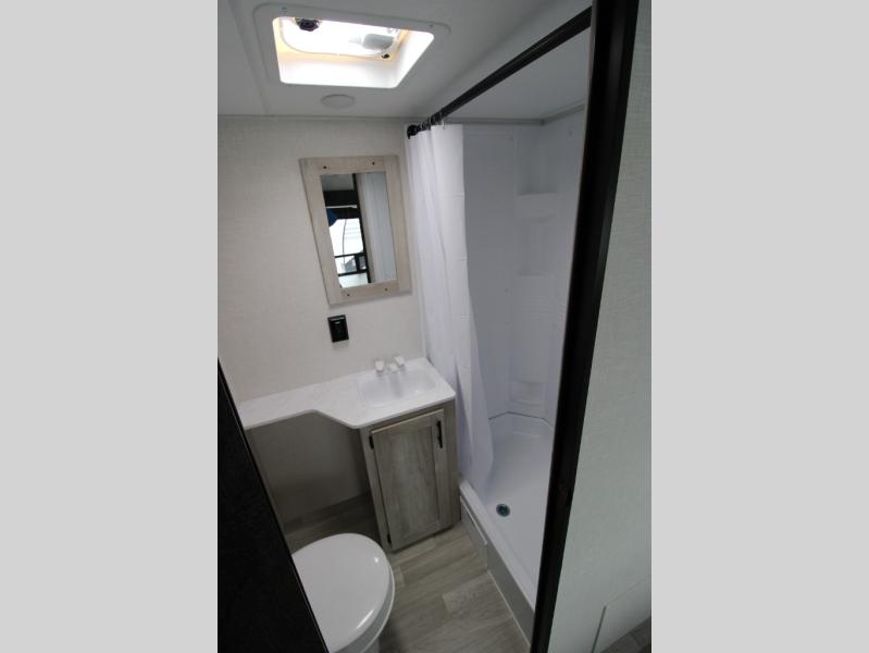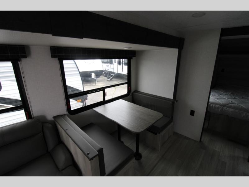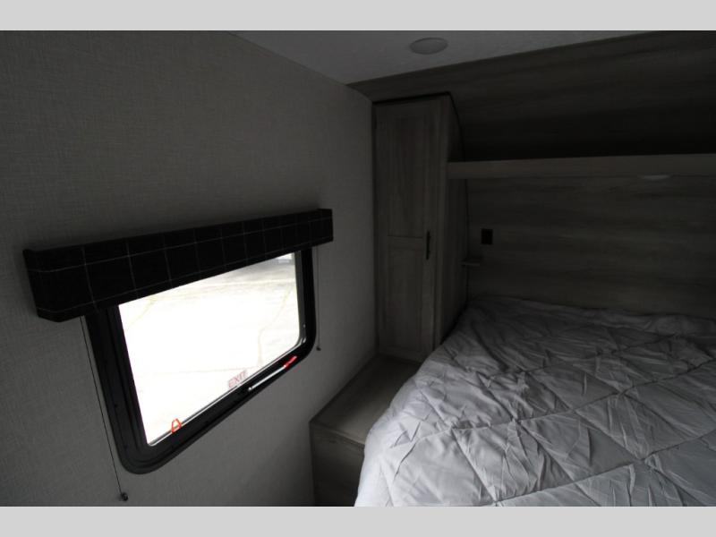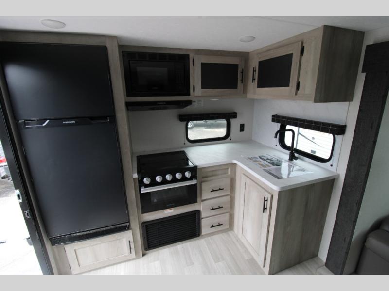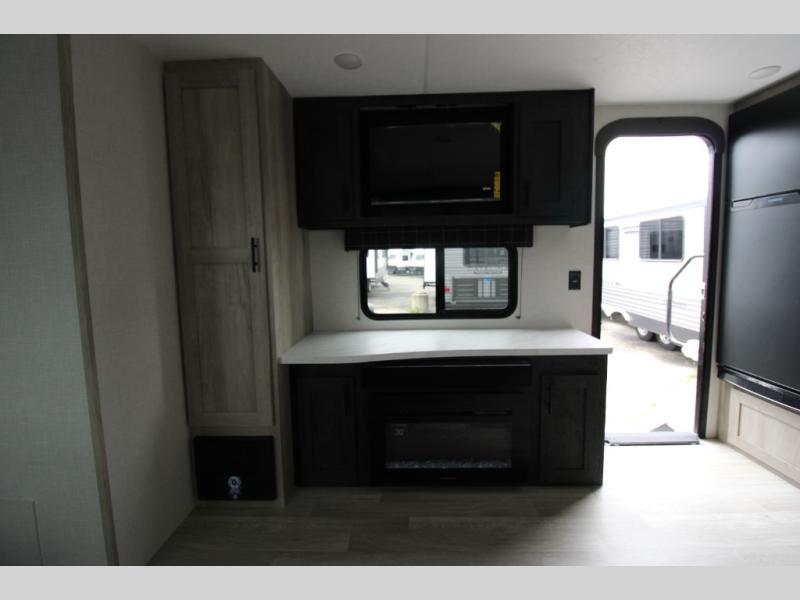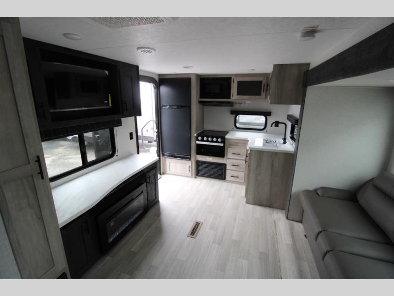You will love the amount of interior space you have in this travel trailer thanks to the large slide out and rear kitchen with plenty of counter space. There is a 70" sofa and 42" booth dinette within the slide out across from the entertainment center, and you can add the optional 30" fireplace here for more comfort. The full bath includes a bath shelf with towel hooks, plus a foot-flush toilet for convenience. You will feel right at home in the front private bedroom that includes a queen bed, dual shirt closets, plus a TV mount if you choose to bring along a television.