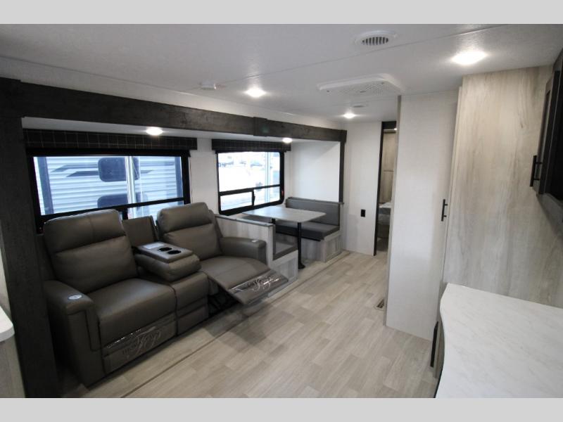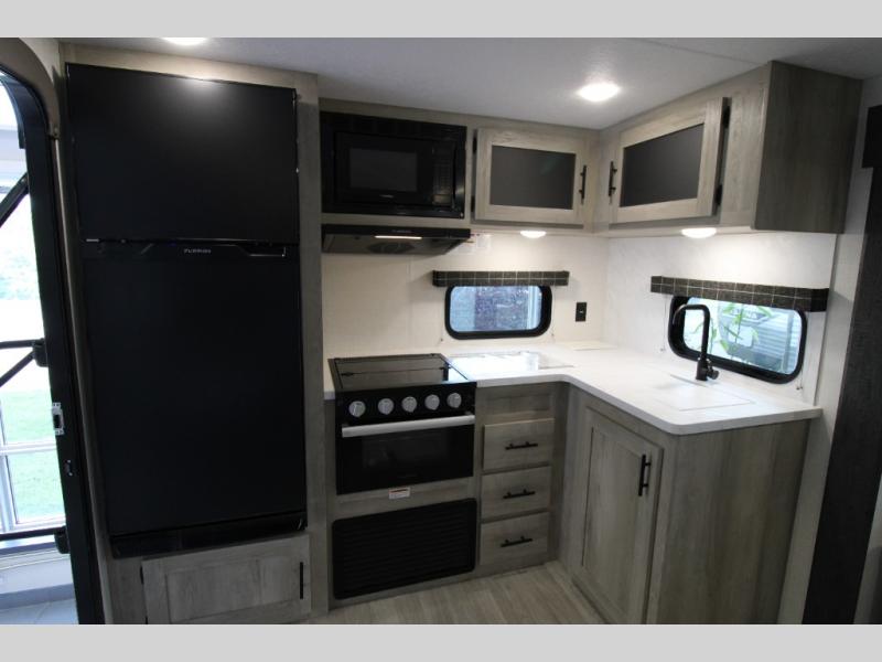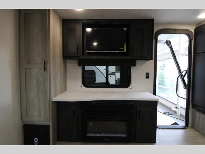 You will love the amount of interior space you have in this travel trailer thanks to the large slide out and rear kitchen with plenty of counter space. There is a 70" sofa and 42" booth dinette within the slide out across from the entertainment center, and you can add the optional 30" fireplace here for more comfort. The full bath includes a bath shelf with towel hooks, plus a foot-flush toilet for convenience. You will feel right at home in the front private bedroom that includes a queen bed, dual shirt closets, plus a TV mount if you choose to bring along a television.