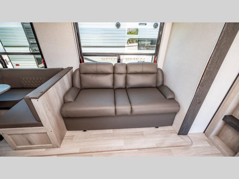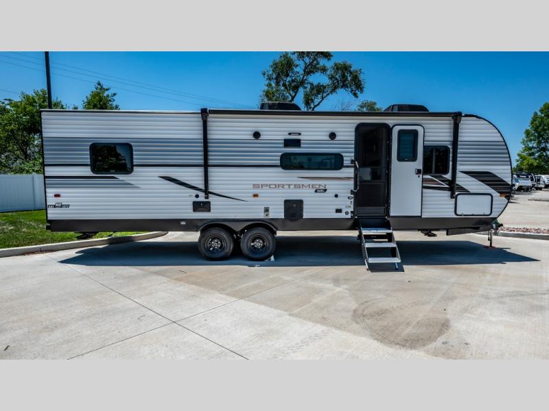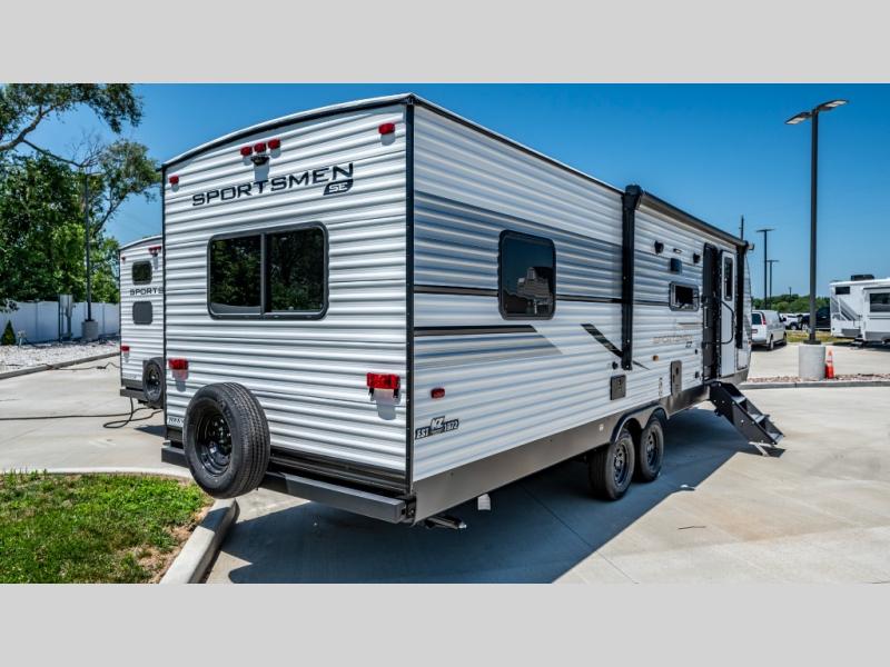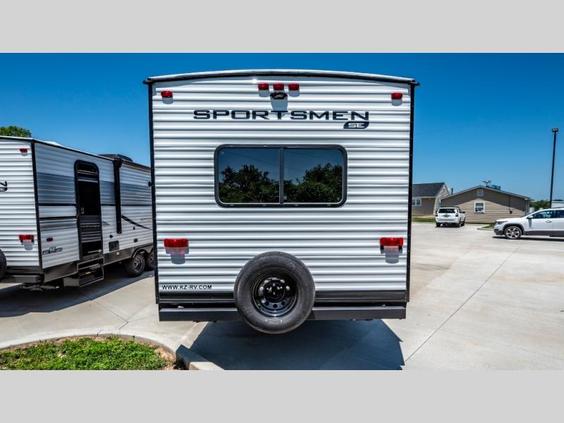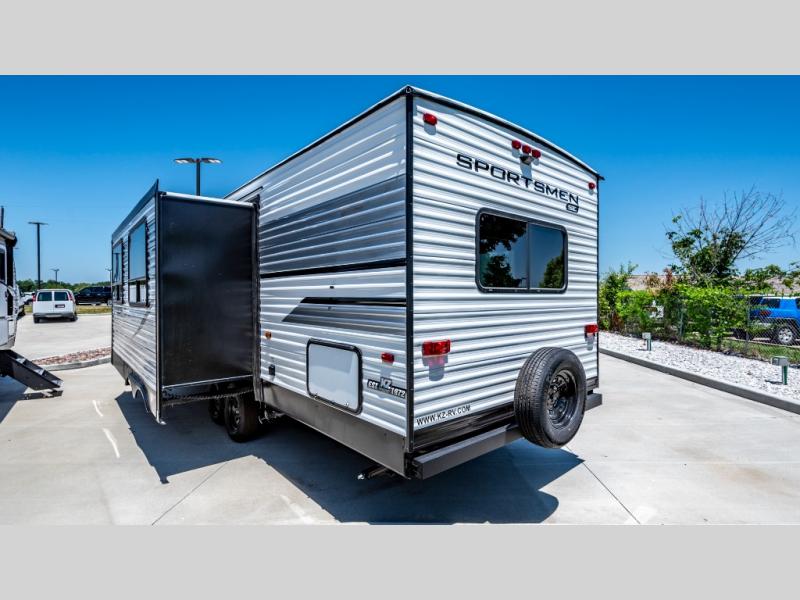 Each Sportsmen SE travel trailer and toy hauler by KZ is constructed with KZ exclusive tough shield exterior metal, a one-piece seamless walk-on Tufflex roofing material, and diamond plate rock guard to protect your unit from road debris. You will appreciate the extra large baggage doors for stowing away your gear when not in use, and tinted windows to help keep the harmful sun rays out plus keeping it cooler inside. Some of the exterior conveniences found in the mandatory Advantage Package are the solid folding steps with a large folding grab handle for easy entry and exit, a full glass friction hinged entry door, plus an exterior shower for your pets or to rinse off before you head inside. You'll also appreciate the nitrogen-filled tires, solar and backup camera prep, plus a Leash Latch with a bonus beverage opener. You'll feel right at home inside with linoleum flooring throughout, a 13,500 BTU air conditioner, large overhead cabinets, a shower surround, and much more!