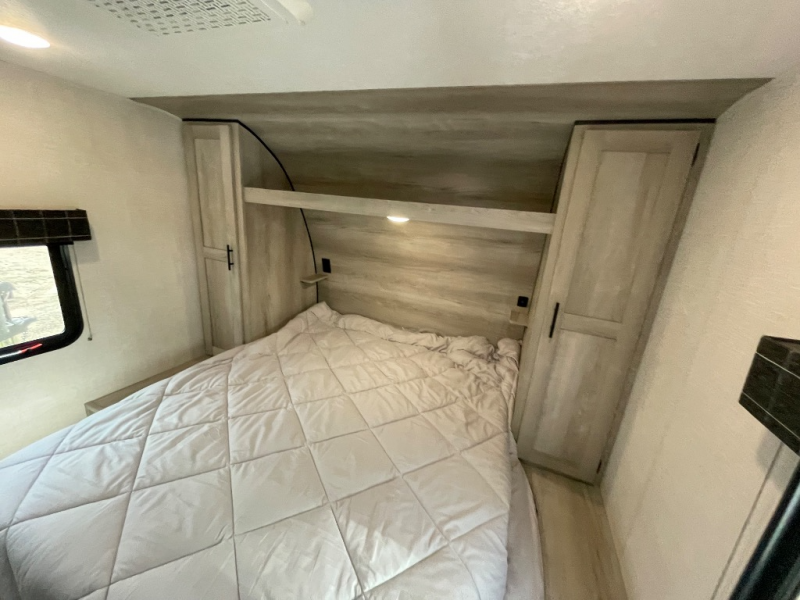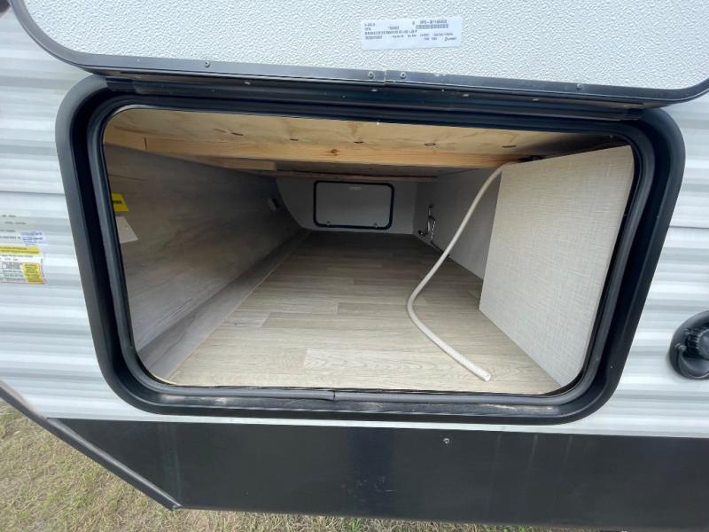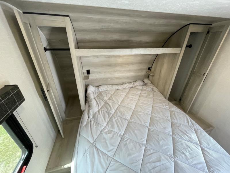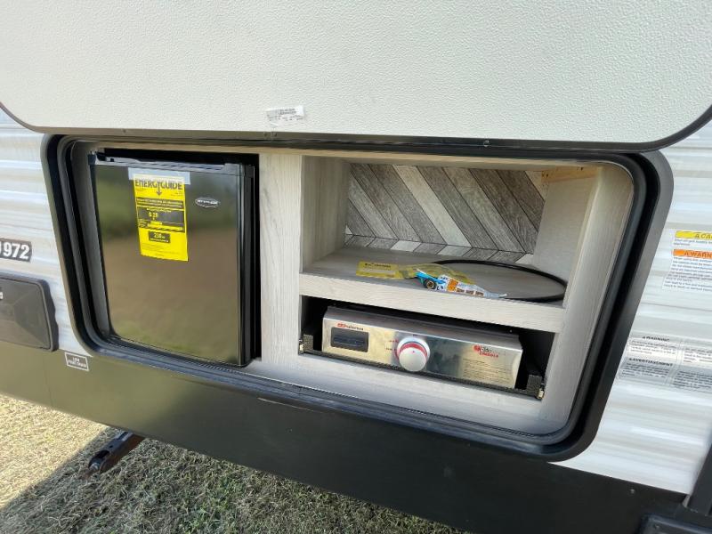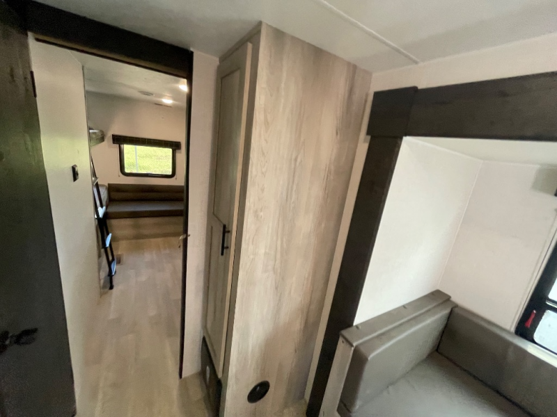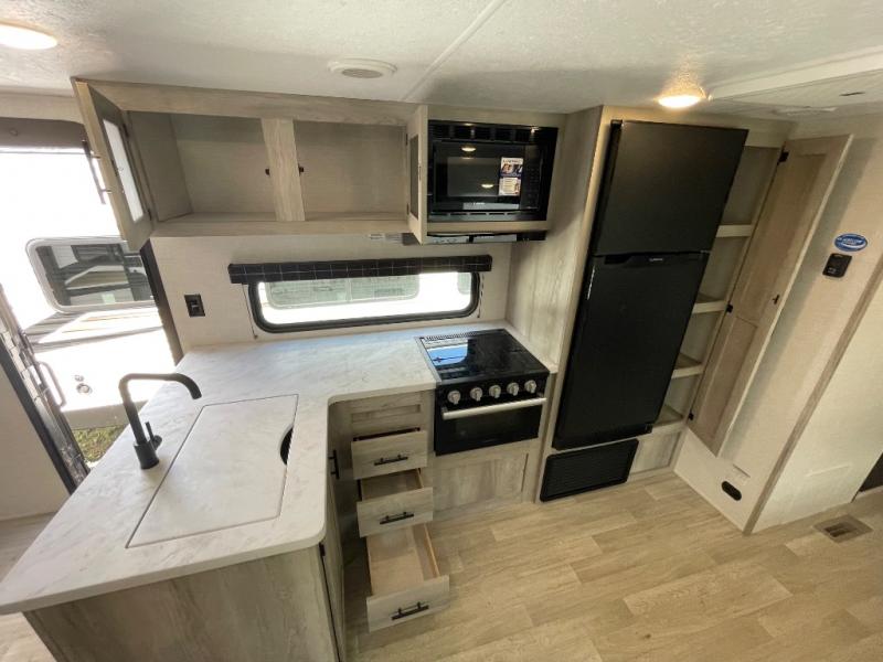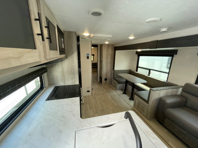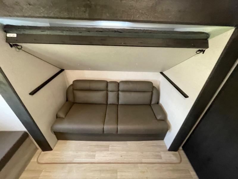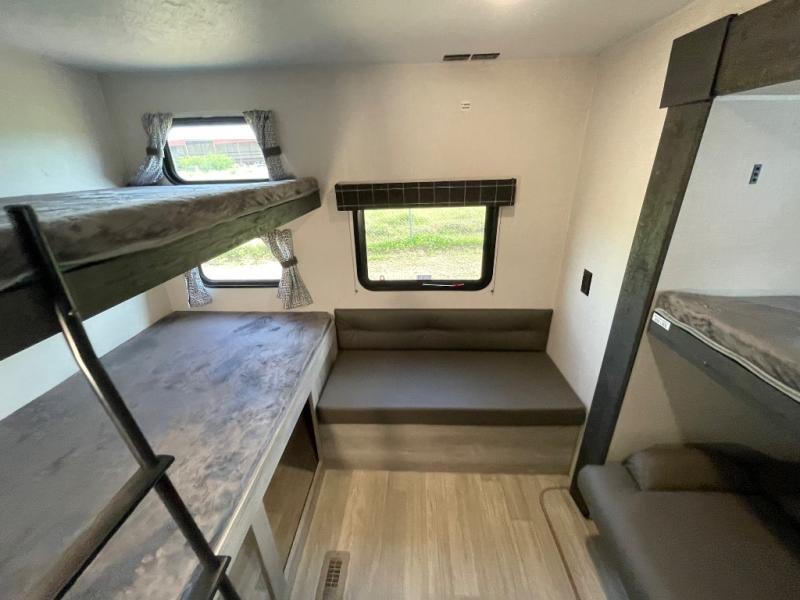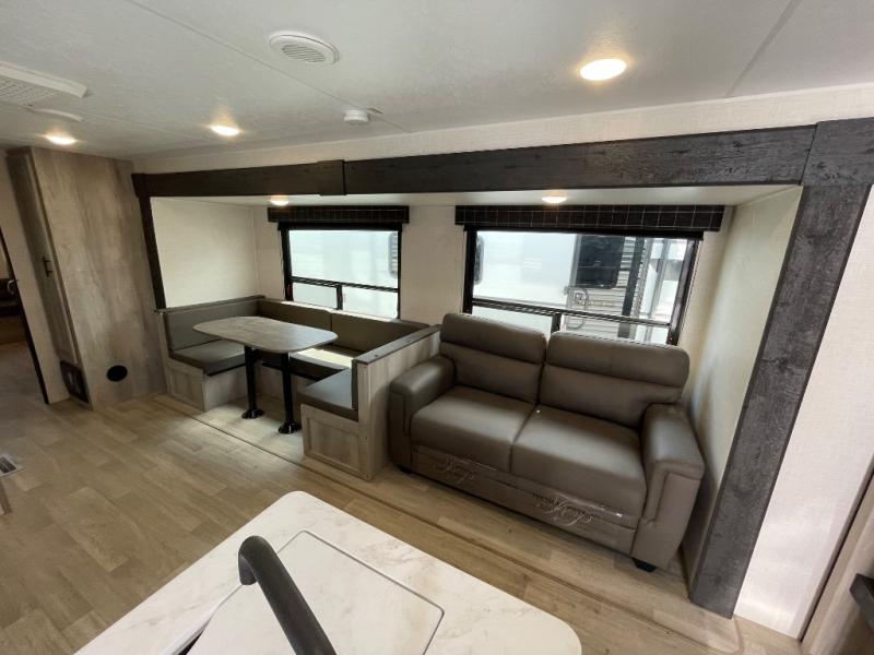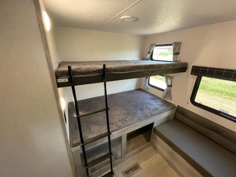 If you've been looking for a travel trailer with plenty of space for your family or group of friends, look no further than this one! The private bunkhouse includes two bunks, plus a third bunk across the room and a jiffy sofa below. There is also a bench seat here, and the full bath is close by for convenience. Everyone can gather in the main living area at the 80" U-shaped dinette, and there is a 64" sofa here for more seating space. If the weather is nice, head outdoors to relax under the 20' power awning with LED lights as the cook prepares dinner on the outside griddle!
