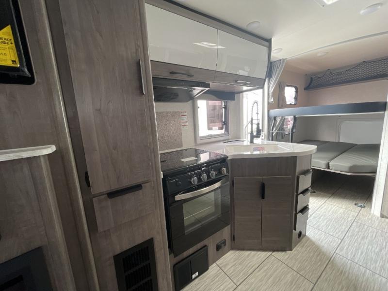 You can take the whole family to a new location with this Lance travel trailer! This trailer has space to sleep eight people with the help of the front queen bed, the U-shaped dinette, and the set of double-size bunks. You'll also have an easy time feeding everyone when you add the optional exterior kitchen because it will give you two kitchens to use. A large slide keeps the interior comfortable with enough space to walk from the front to the back, and the full bathroom is right next to the bunks for late-night bathroom breaks.