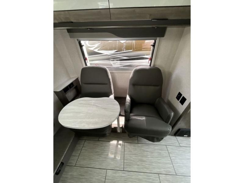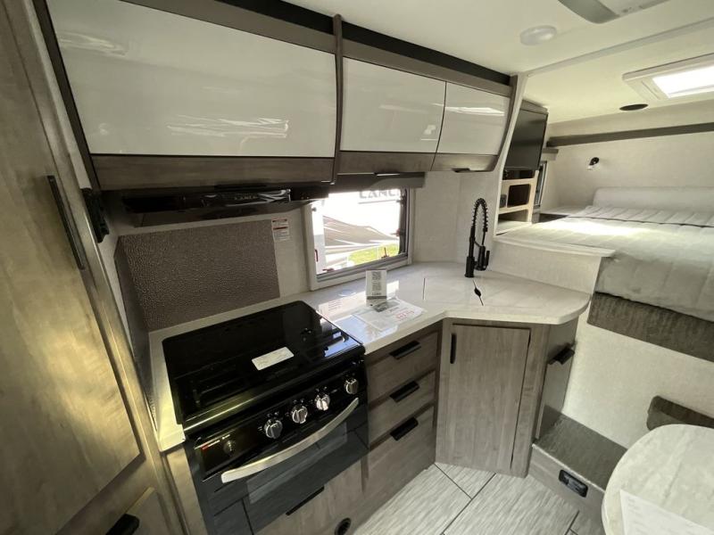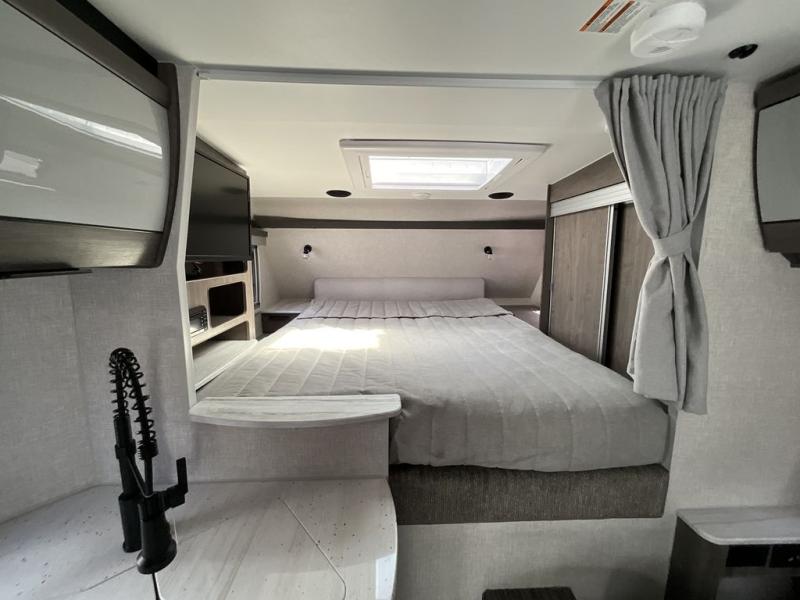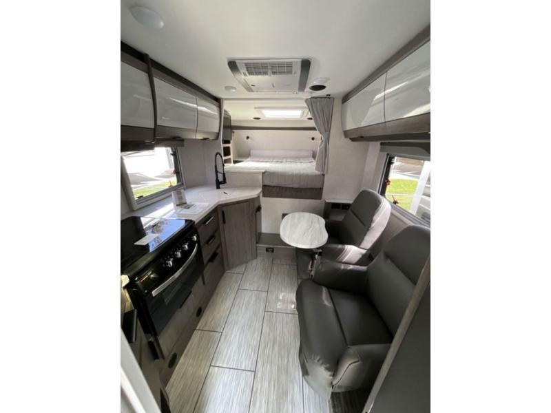 This truck camper combines the most desired must-have features with functionality! The front queen bed has a wardrobe next to it for your clothes, and places to set your electronics or a book, plus a privacy curtain to draw at night. Each swivel chair has a table in front for you to enjoy your meals at or you can switch them out for the optional theater seating for a comfortable place to take a quick afternoon nap. Start and end your days feeling refreshed with the wet bathroom, and throw any unwanted trash into the hidden trash compartment.
