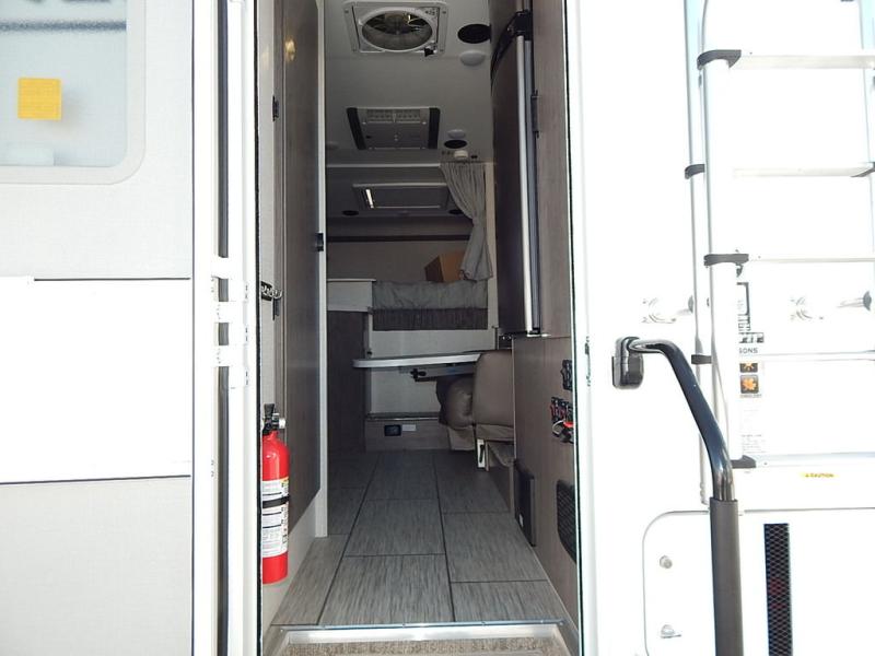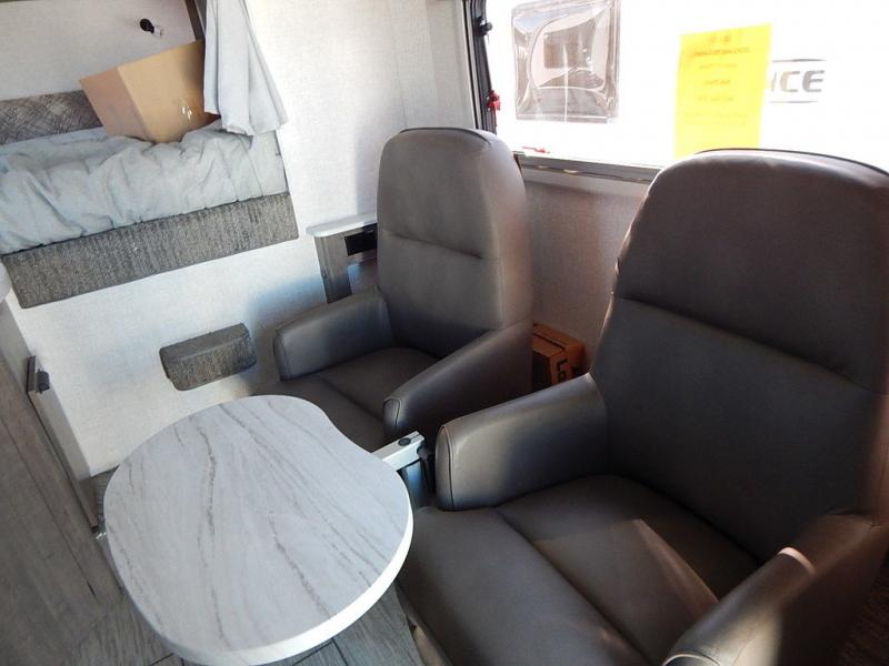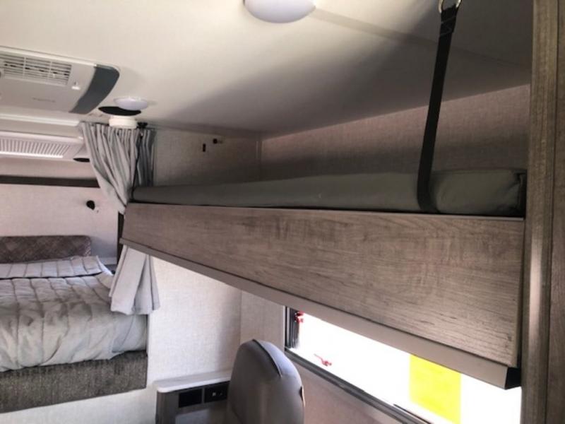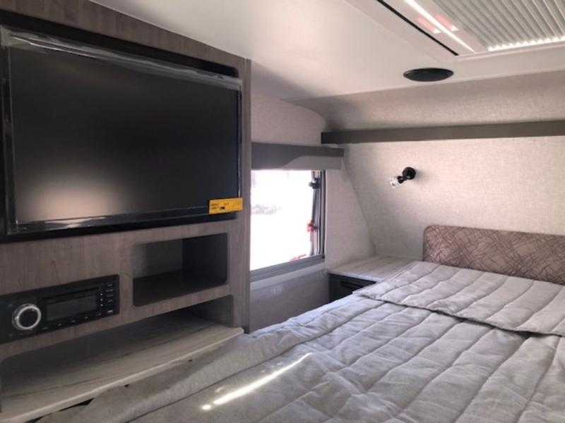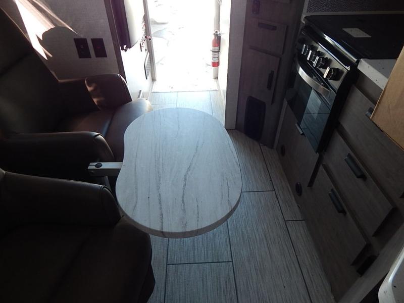 This truck camper combines the most desired must-have features with functionality! The front queen bed has a wardrobe next to it for your clothes, and places to set your electronics or a book, plus a privacy curtain to draw at night. Each swivel chair has a table in front for you to enjoy your meals at or you can switch them out for the optional theater seating for a comfortable place to take a quick afternoon nap. Start and end your days feeling refreshed with the wet bathroom, and throw any unwanted trash into the hidden trash compartment.