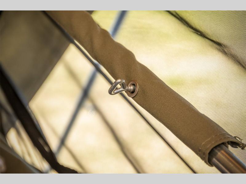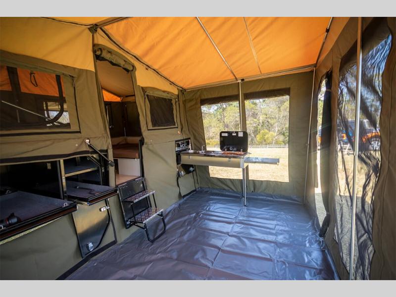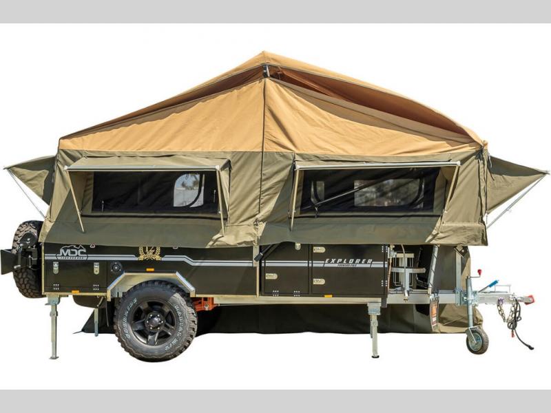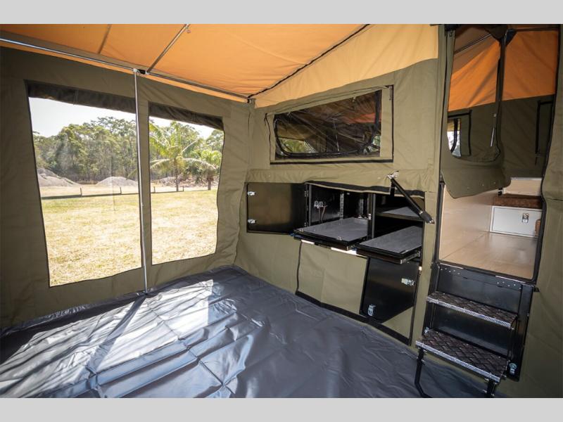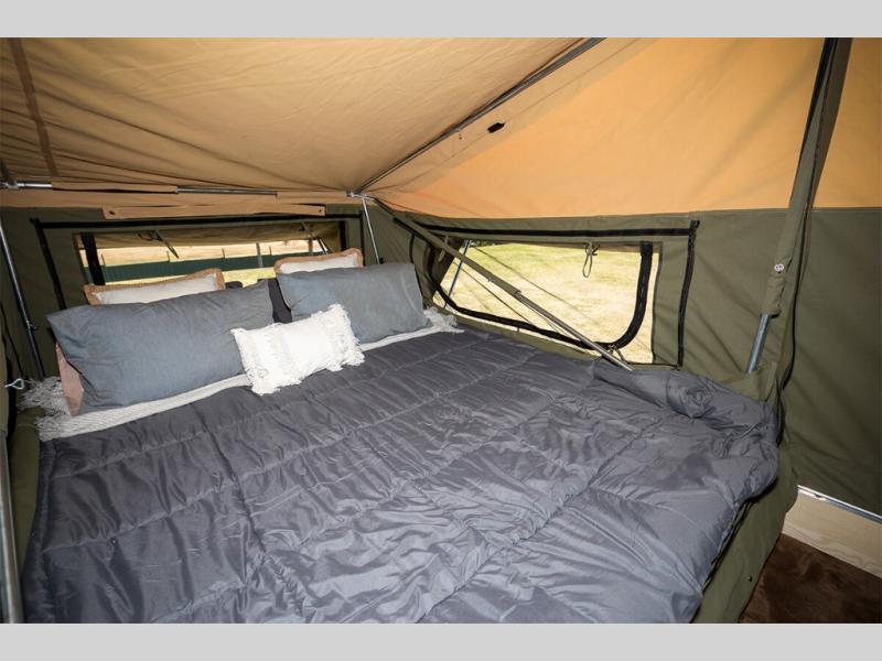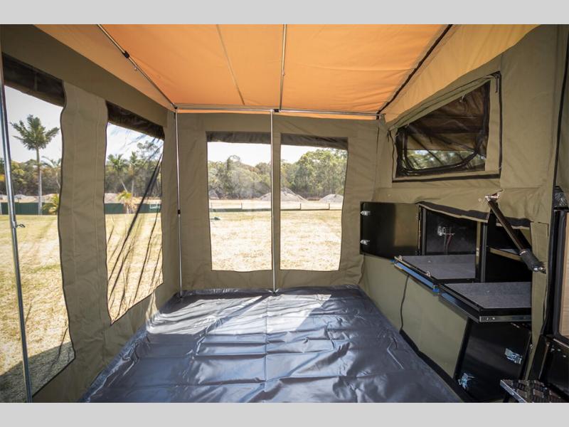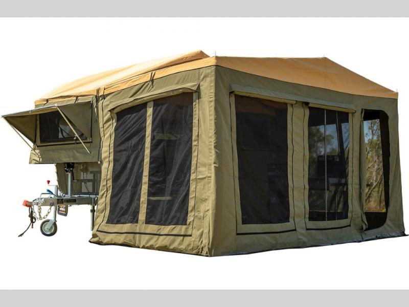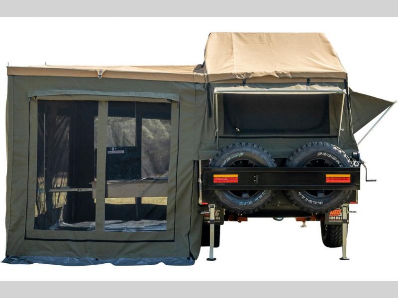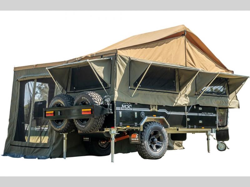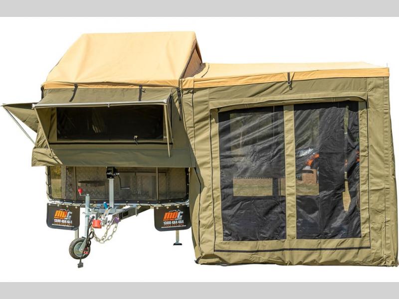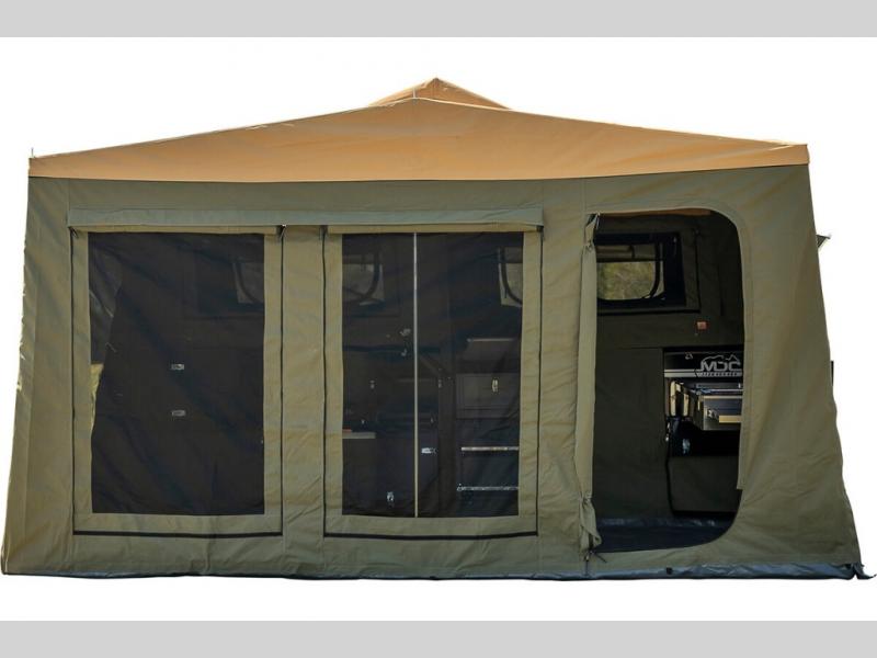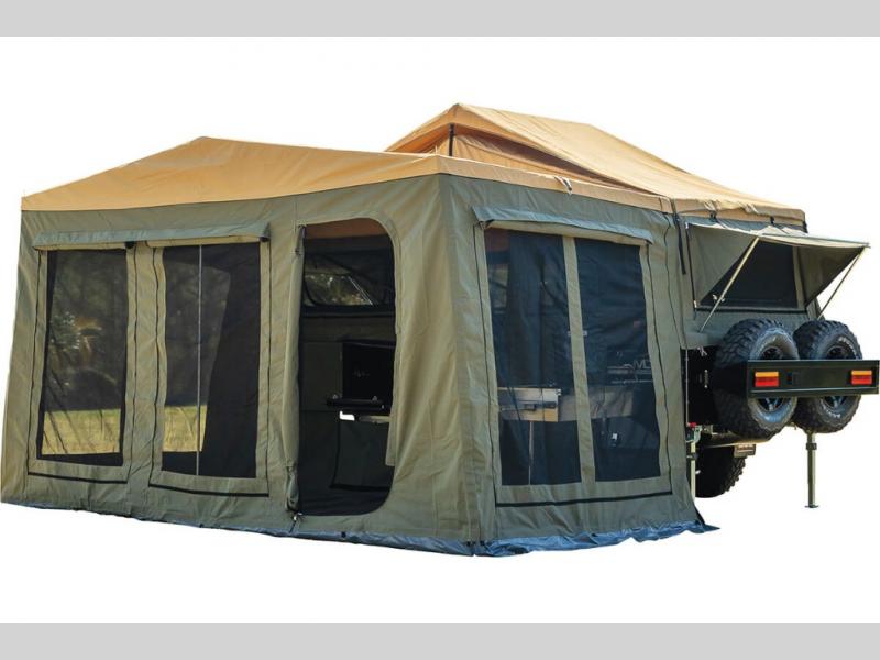 Take your adventures up a notch with the Expedition Series pop-up off-road trailers by MDC USA! Each one is built with a durable welded zinc galvanized frame with bonded zinc coated panels for added strength. You can go off the beaten path with Goodride radial mud tires with two spares, 12" electromagnetic brakes, and X-TRACK independent coil spring suspension with 2X TOUGH TRAX shock absorbers on each side. The tent and annex offers up to 237 sq. ft. of living space between the main tent and fully enclosed annex so you can enjoy more room to relax. Outside, you'll find a removable, side-mounted storage rack, solar power, plus external power outlets to keep you going!