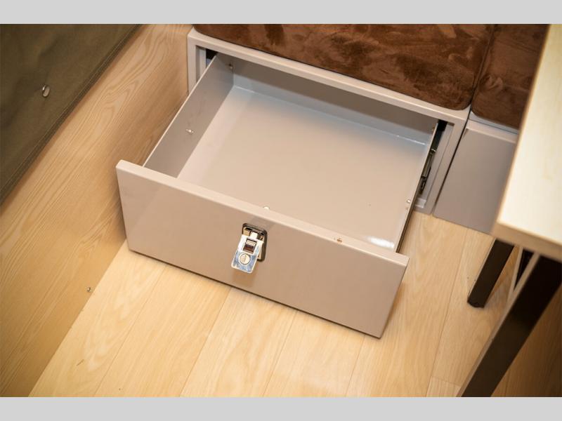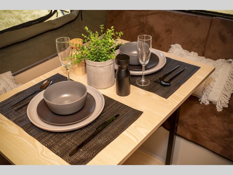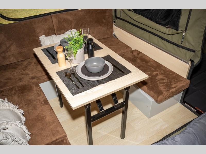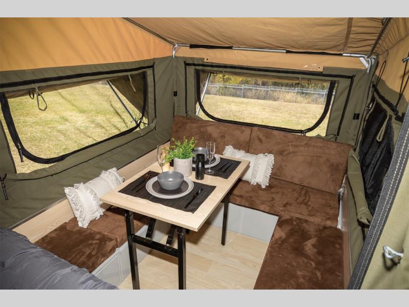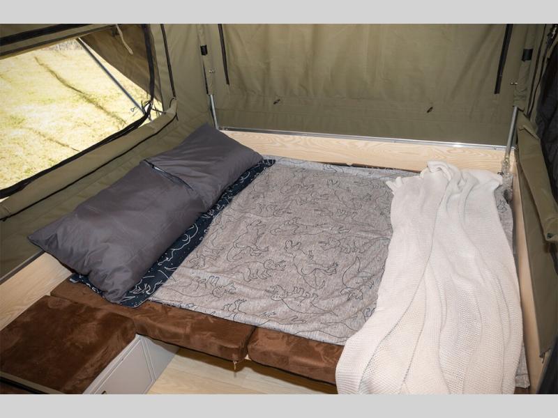 Exploring the great outdoors just got easier in this pop-up off-road trailer. You can sleep five people since there is a king-size mattress and convertible lounge, and the zip-up internal window covers will give you privacy when you need it. There is under-bed storage for your personal belongings, plus a front storage box that houses the refrigerator. The slide out three burner cooktop and sink will let you make meals each day without having to use a campfire, and the 5 gallon portable toilet means you won't have to use the camp's facilities in the middle of the night.