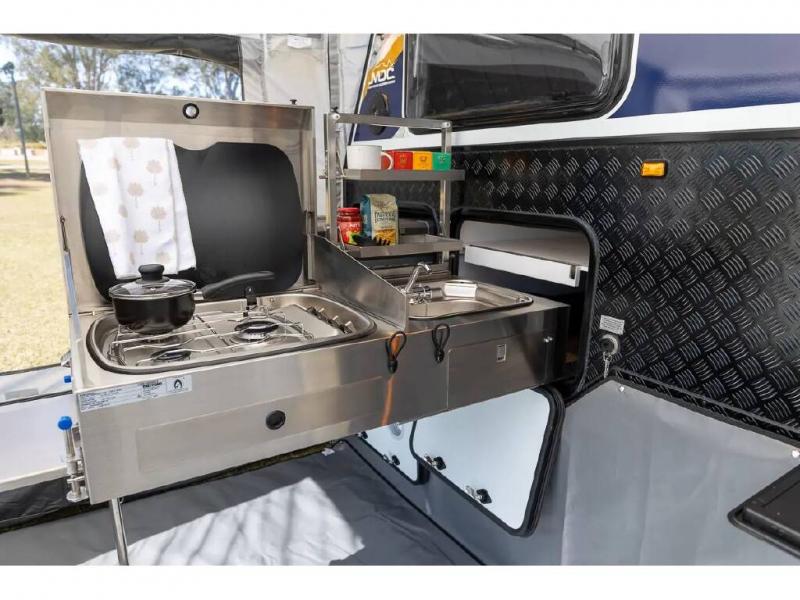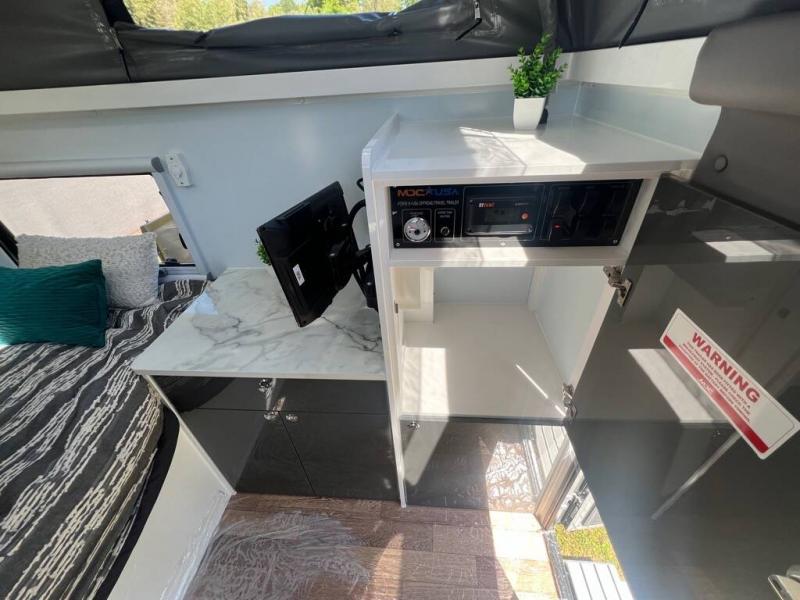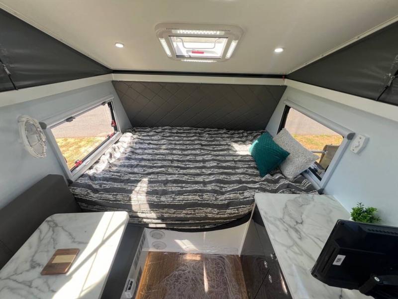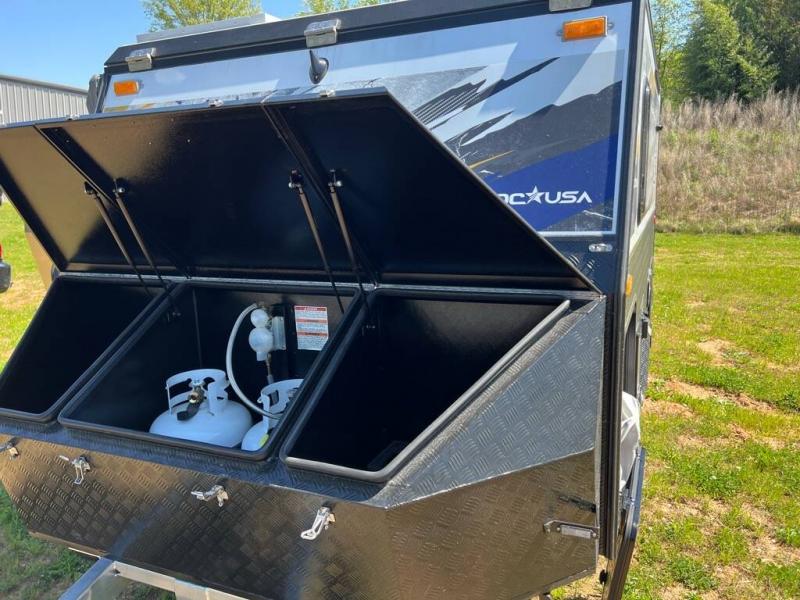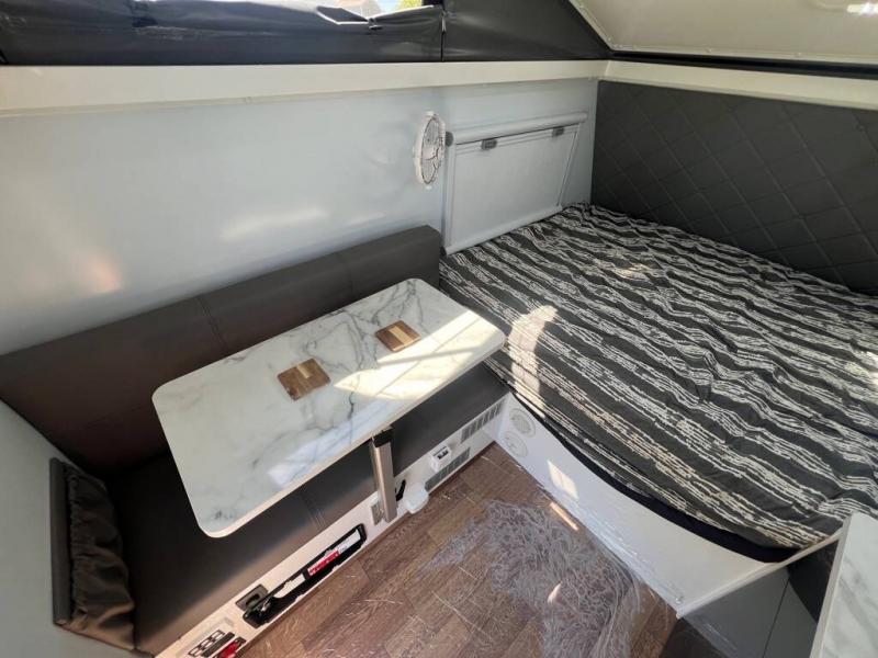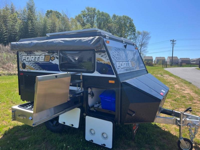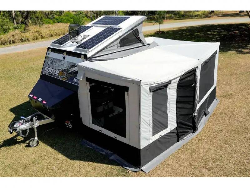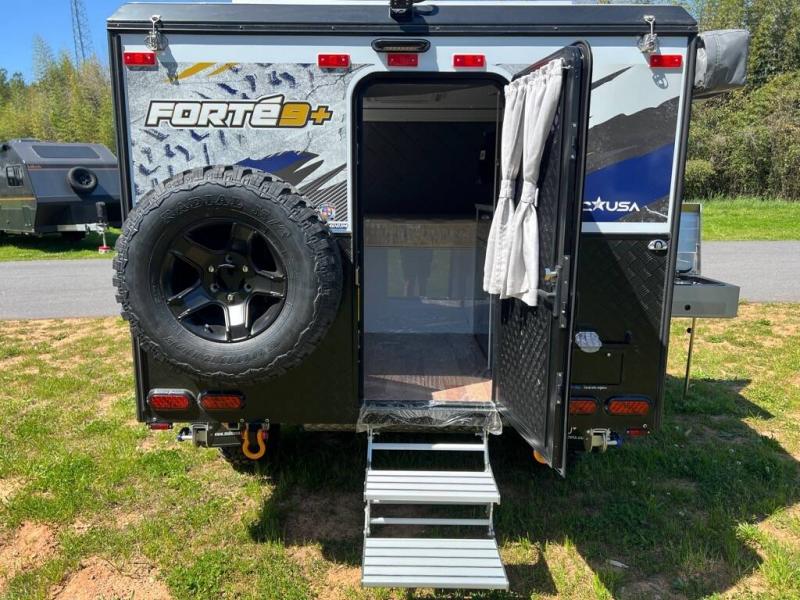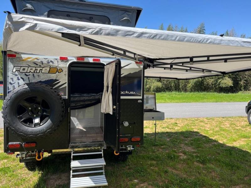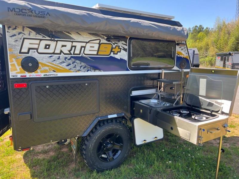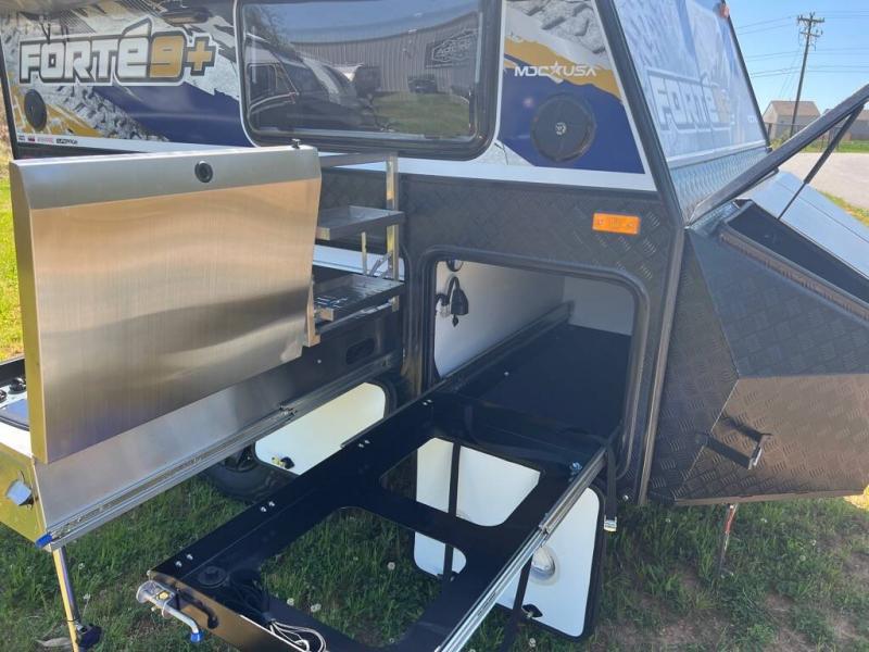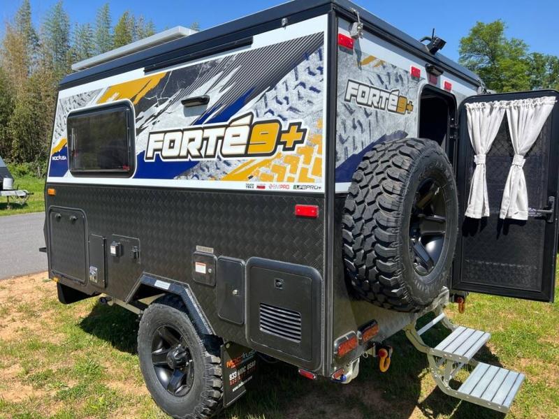Explore more roads with the Forte 9+ off-road trailer by MDC USA! The galvanized steel hot rolled rectangle tube frame chassis is ultra durable and the X-TRACK independent coil spring suspension with 2X TOUGH TRAX shock absorbers on each side will help you tackle tough terrain. There is a free-standing 270° awning, along with a full wrap-around annex, enclosed roof, walls, and draft skirt that will give you more living space when set up. A Cruisemaster DO35 hitch also comes standard, as well as 12" electromagnetic brakes, and four heavy-duty lockable and adjustable drop-down stabilizer legs. Some of the electrical features included are the AIMS Power 200W Pure Sine wave inverter, LiFePRO+ 12V 200Ah lithium iron phosphate battery, internal and exterior LED lighting, and many more amenities to keep you powered up!