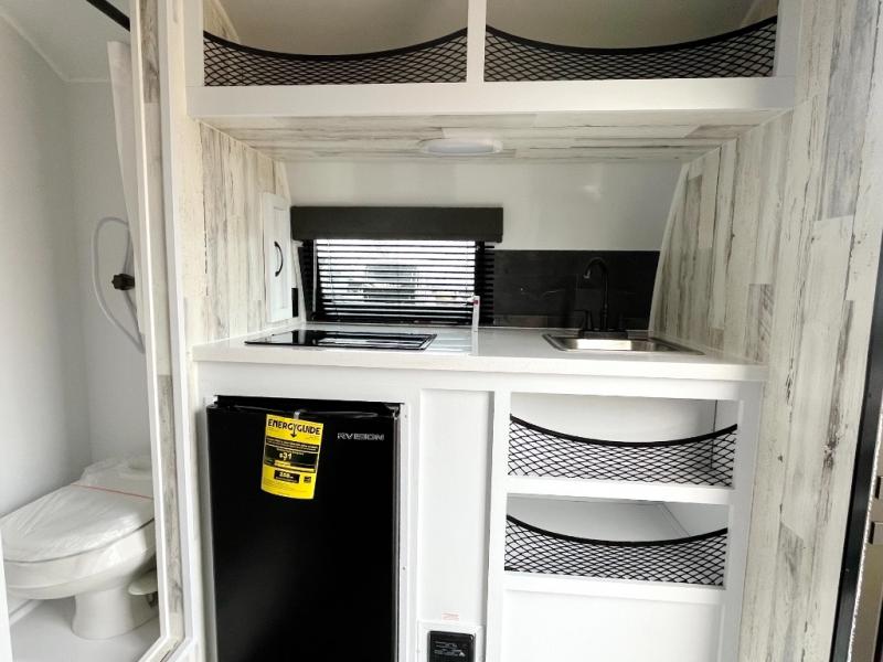 Bring the conveniences of your home with you to the campground in this teardrop trailer! The thoughtfully designed kitchen includes a pull out drawer for spices, a solid surface Corion countertop with backsplash, a water proof paper towel holder, a solid surface sink with faucet for easy clean up, and an Ever Chill Fridge to enjoy cold beverages. You will get a good night's rest on the comfy 6" memory foam mattress that also converts into a dining room table with seating. The bathroom has a Dometic toilet, a shower, and a two way vent fan to eliminate the steam. Plus, you have an outside shower/spray port to rinse the mud off your feet before entering inside. Store all of your gear in the 36" x 14" exterior baggage door with nylon organizer pockets, and you will also appreciate the waterproof storage organizer!