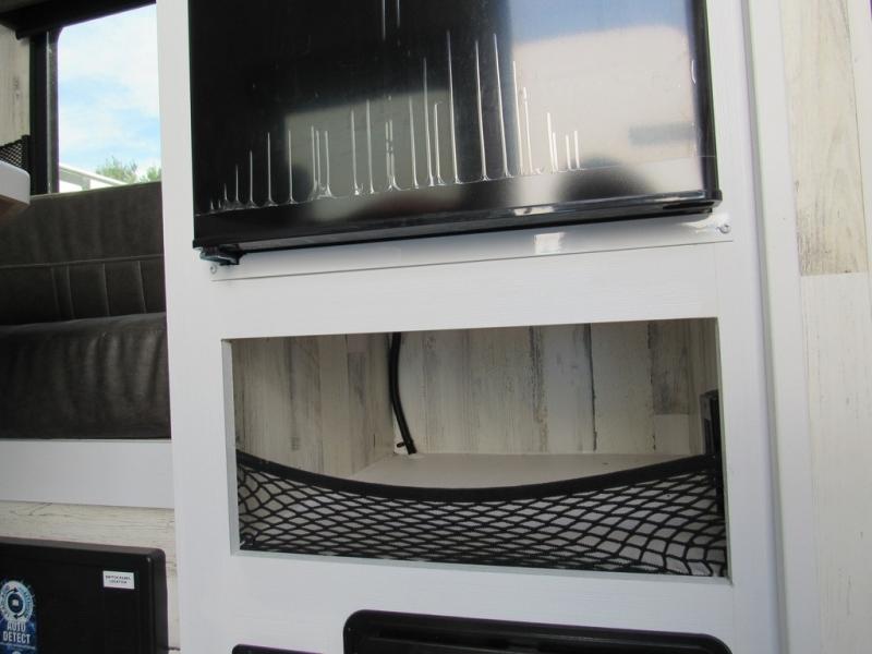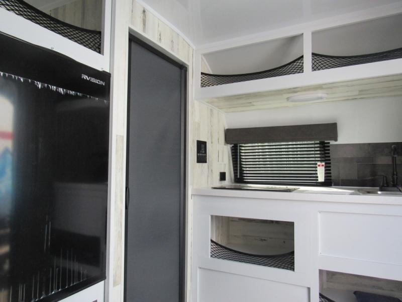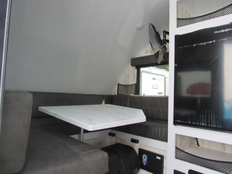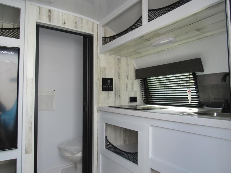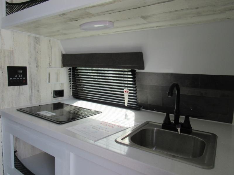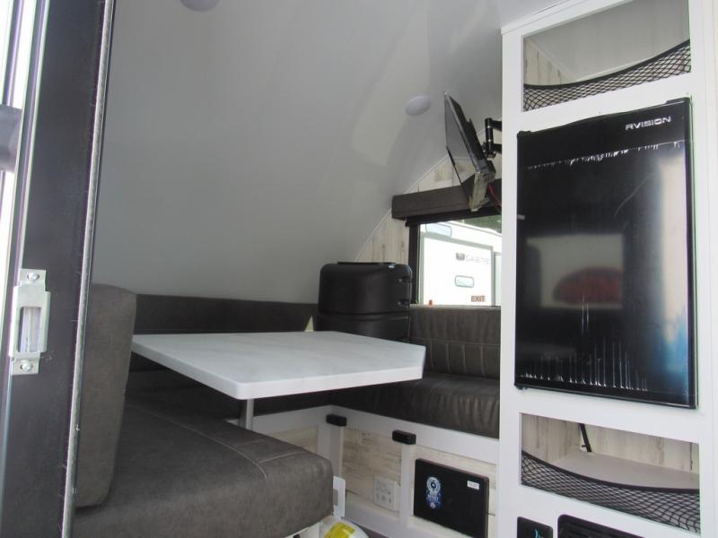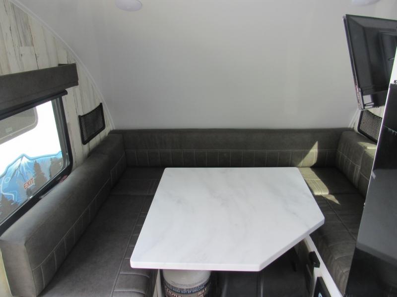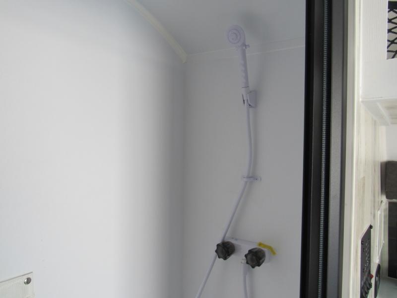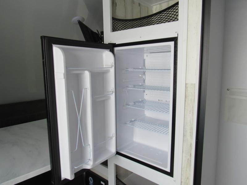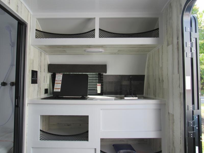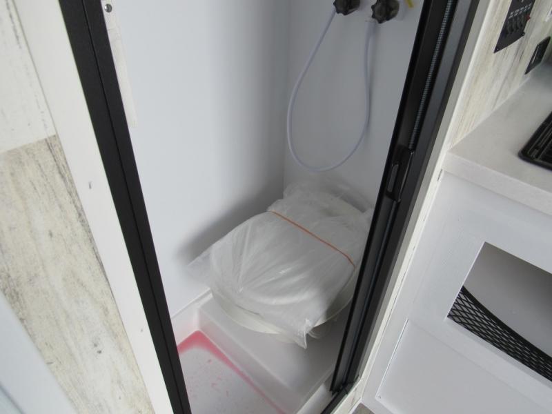 Bring the conveniences of your home with you to the campground in this teardrop trailer! The thoughtfully designed kitchen includes a pull out drawer for spices, a solid surface countertop with backsplash, a water proof paper towel holder, a solid surface sink with a faucet for easy clean up, and a large refrigerator to enjoy cold beverages. You will get a good night's rest on the comfy 6" memory foam mattress that also converts into a dining room table with seating. The bathroom has a Dometic toilet, a shower, and a two way vent fan to eliminate the steam. Plus, you have an outside shower/spray port to rinse the mud off your feet before entering inside. Store all of your gear in the 36" x 14" exterior baggage door with nylon organizer pockets, and you will also appreciate the waterproof storage organizer!