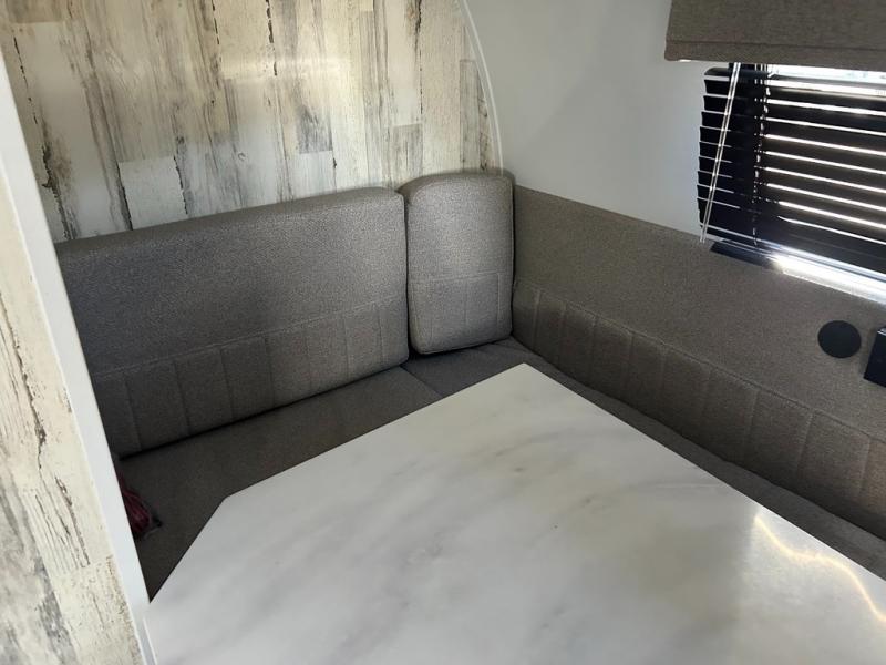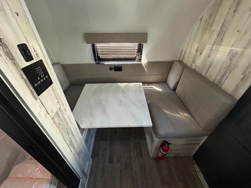 If you're looking for a teardrop trailer with a little more space, check out this Big Buggy BB14! There is a front U-shaped dinette that can convert to cozy sleeping space, a Recpro two burner stove, plus a large refrigerator. You can clean up each day in the wet bath that includes a two way bath vent fan plus a Dometic toilet. The exterior baggage door will keep all your gear secure, and the torsion axle will provide smooth towing from home to campground. There are also a variety of exterior graphics packages you can choose from that best fit your style!